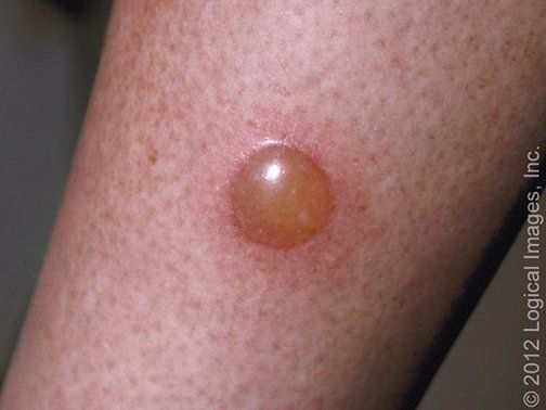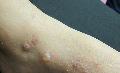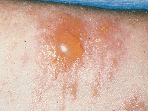 ● Bullous impetigo – Bullous impetigo should be differentiated from other blistering skin conditions. Examples include autoimmune blistering diseases (table 1), acute contact dermatitis (picture 7), bullous drug eruptions, burns, bullous insect bite reactions (picture 8A-B), varicella (picture 9), and subcorneal pustular dermatosis (picture 10). The progression from bullae to erosions with peripheral crust is characteristic of bullous impetigo.
