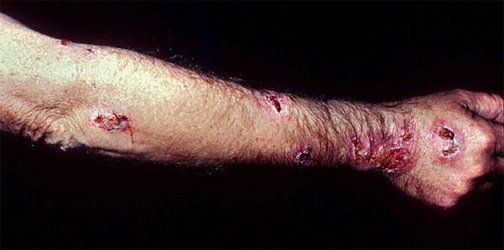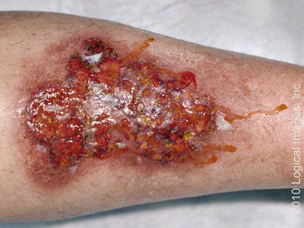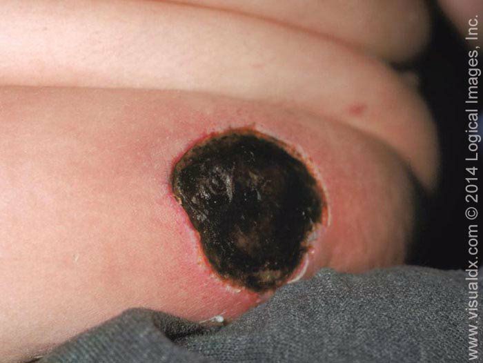 ● Ecthyma – The differential diagnosis of ecthyma often includes other conditions that may cause localized ulcers, such as mycobacterial or deep fungal infections (picture 11A-B) or pyoderma gangrenosum (picture 12A-B). Ecthyma can be confused with ecthyma gangrenosum, a potentially life-threatening skin condition that occurs in patients with pseudomonal bacteremia. In ecthyma gangrenosum, painless erythematous or purpuric macules rapidly evolve into hemorrhagic vesicles or bullae that subsequently rupture to leave an ulcer with necrotic black eschar (picture 13A-B). Unlike ecthyma, patients with ecthyma gangrenosum are usually systemically ill.