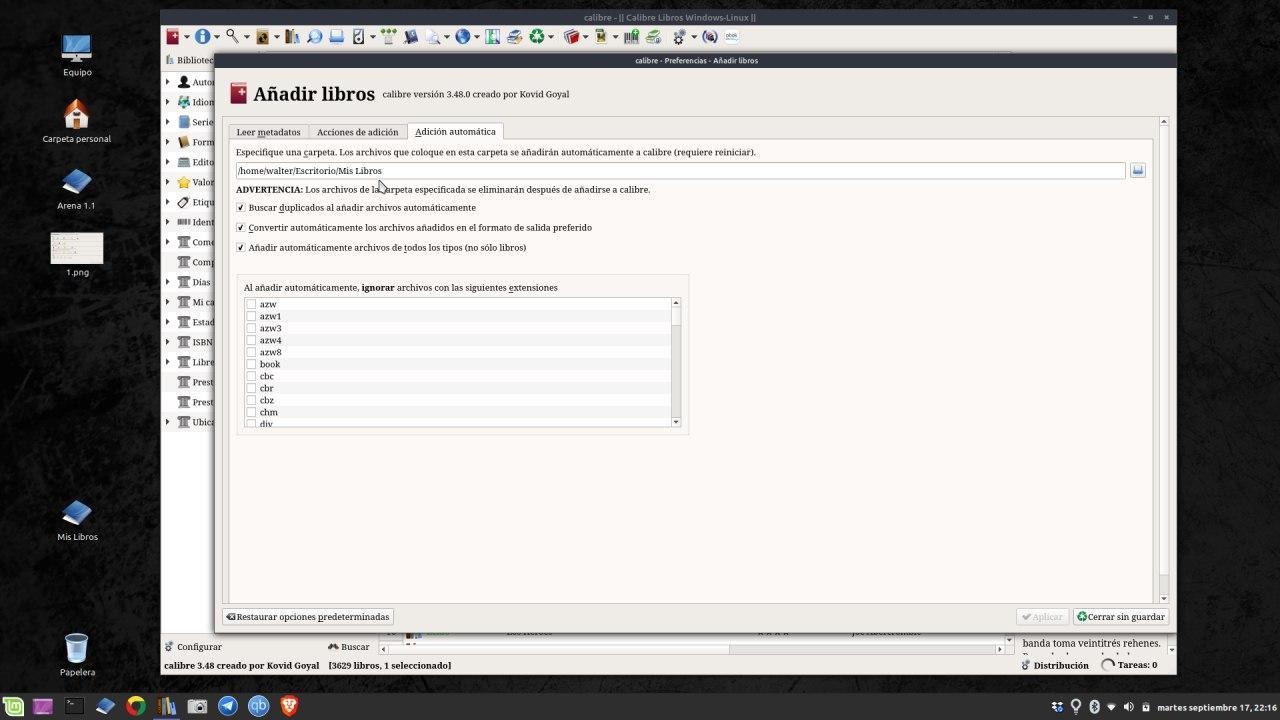 Y nos vamos a la tercer solapa Adición Automática en el renglón ponemos la ruta de la carpeta de donde Calibre tomará los libros, Marcamos las tres opciones. 1 Nos avisa si tenemos ya el libro cargado, para no cargar duplicados ( muy recomendable ) y las otras dos están claras. También podemos marcar la extensión que deberá ignorar de esta carpeta en la lista de extensiones. Tocamos Aplicar y reiniciamos Calibre.
