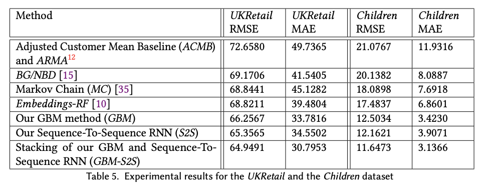Авторы сравнивали свой подход с простым средним за период до, BG/NBD, Markov Chain, Embeddings-RandomForest моделями. При этом, сравнивались еще и отдельные части подхода (отдельно GBM, отдельно RNN, отдельно их стекинг). Результаты ниже. Использовались два набора данных - в одном предсказания были на 6 месяцев вперед, в другом на 4 недели (и его я считаю достаточно бессмысленным со стороны бизнеса, т.к. чаще бизнес хочет предсказание LTV хотя бы на несколько месяцев вперед, а лучше - на год и больше).