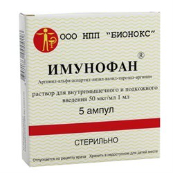 Имунофан О препарате Имунофан синтезирован на основе естественного пептидного гормона иммунитета вилочковой железы - тимопоэтина . Препарат содержит в качестве активной фармакологической субстанции гексапептид структурной фомулы arginyl-alpha-aspartyl-lysyl-valyl-tyrosyl-arginine с молекулярной массой 836 Da .
