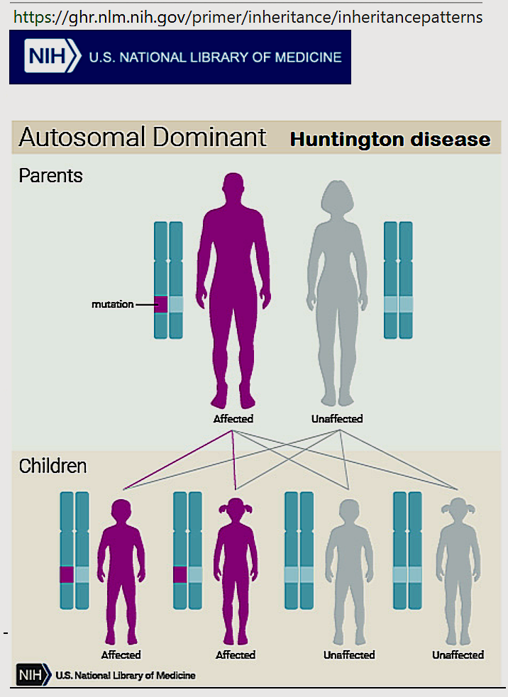 Autosomal dominant inheritance requires that only one copy of a gene pair be defective in order to develop the disorder . Each offspring of a Huntingtons disease is Autosomal dominant , i .e . a 50% chance of inheritance if one parent has the gene . Where as sickle cell anemia is autosomal recessive .