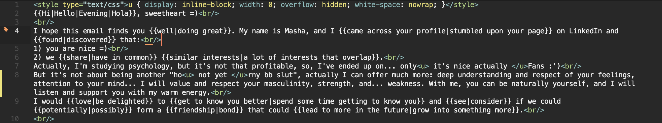 В нем тегу u мы задаем строчно-блочный тип, нулевую длину, команду скрывать переполнение его текстом, и запрещаем перенос строк, чтобы он не вырос в высоту. Затем вычитываем наше письмо, и каждое слово, которое нам не нравится разбиваем тегом u, содержищим какую-то фразу. Например: