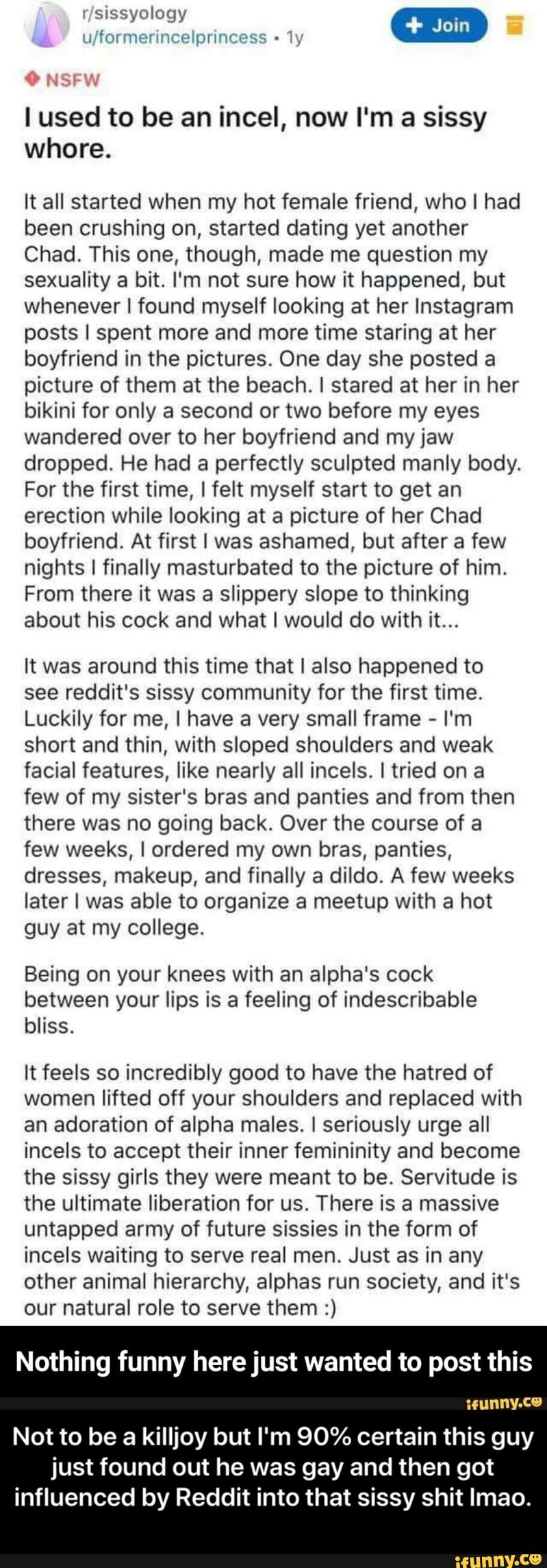 Okay I am an incel . I hate and think women are all evil . With the exception of my mom, my sister, my cousins and my aunts I hate women, I think women are inferior to men . In fact I get so enraged when someone says that there equal to men . I mean a woman is good for only a few things, which are . . .