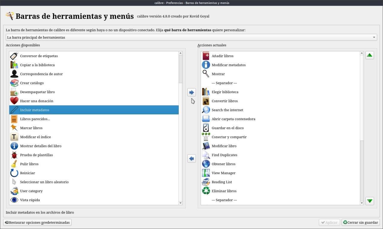 Tocamos barra principal de herramienta marcamos incluir metadatos y con la flecha azul lo pasamos de la columna izquierda a la derecha. Tocamos aplicar y ya tememos es icono en la barra de Calibre.