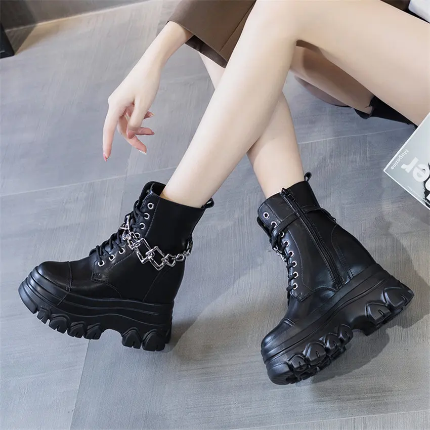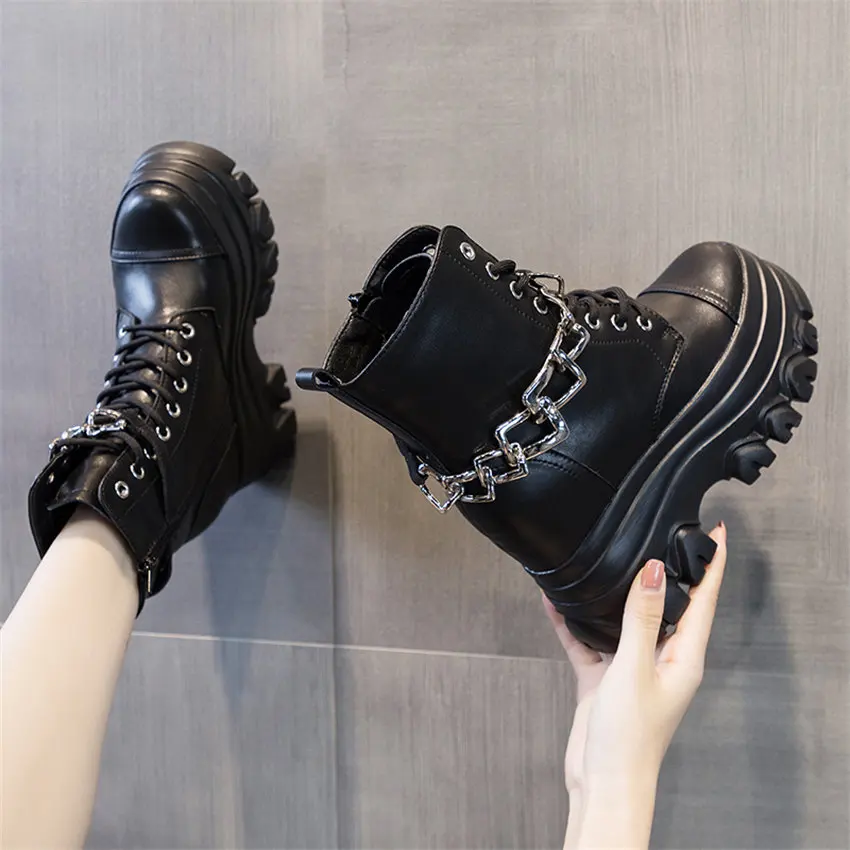 QSkAnFXLДолго искали Increasing Height Motorcycle Ankle Boots Women Genuine Leather Round Toe Lace Up Big Chain Platform Wedge Winter Boots Punk Goth, но не могли найти? Предоставляем вашему вниманию Increasing Height Motorcycle Ankle Boots Women Genuine Leather Round Toe Lace Up Big Chain Platform Wedge Winter Boots Punk Goth по лучшей цене на рынке!