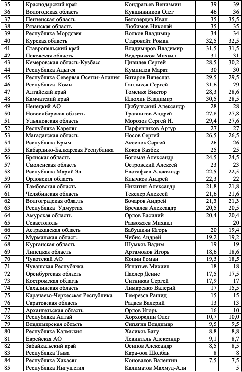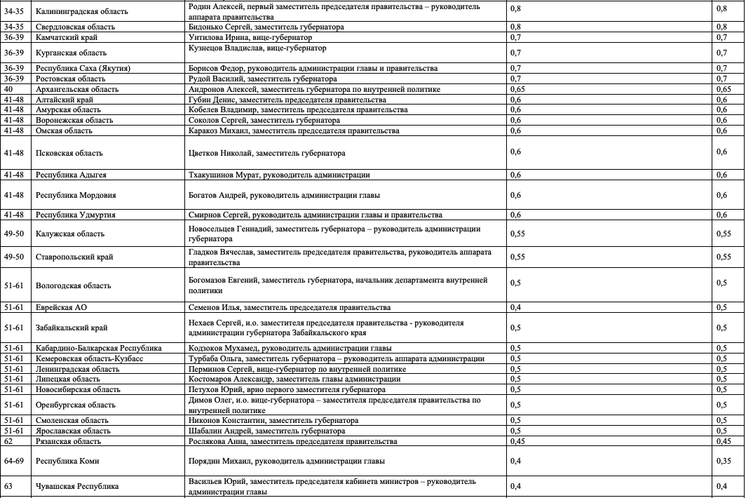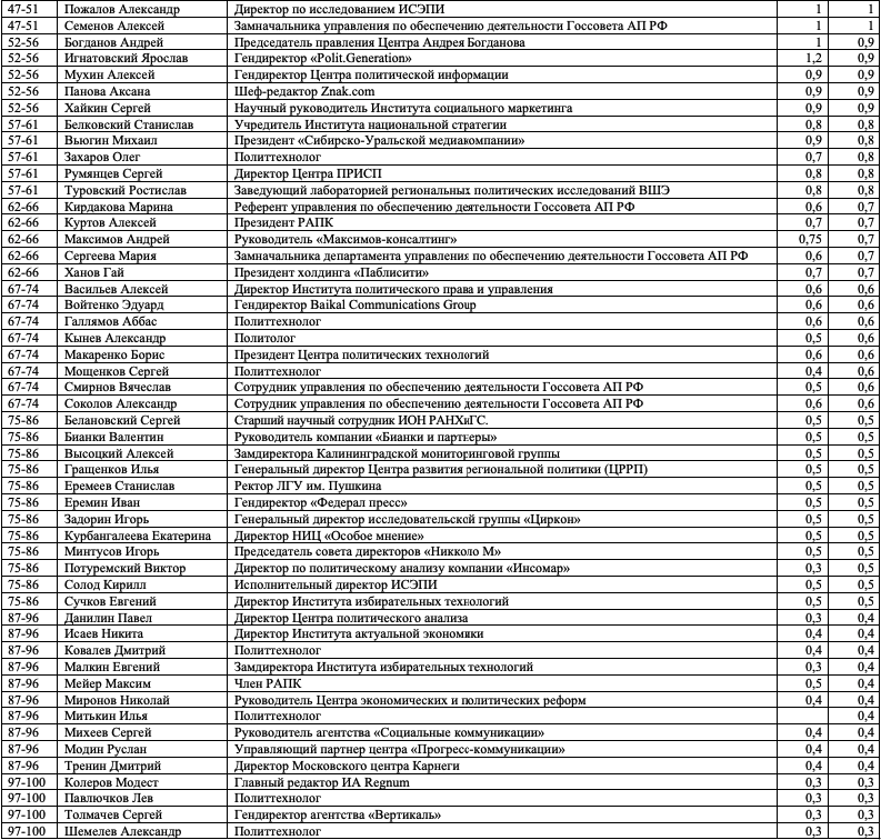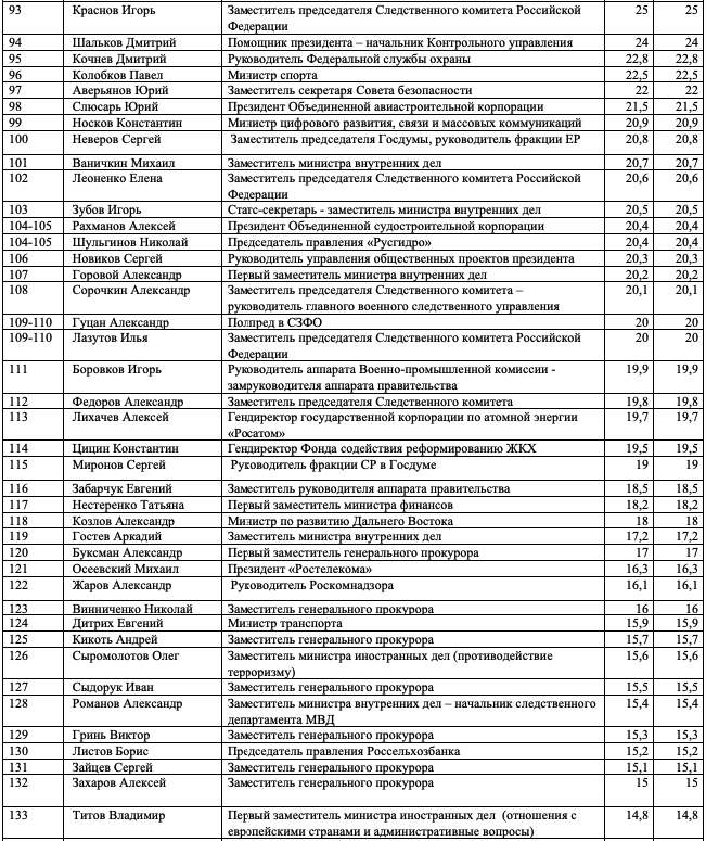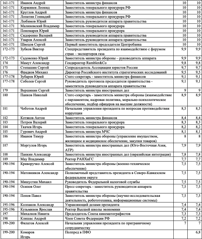 Как и в предыдущих выпусках индекса, слагаемыми оценки, полученной каждым из участников, являются профессиональная репутация персоны, ее аппаратно-лоббистский потенциал, значимость курируемой сферы, возраст, наличие крупных успехов и/или неудач. Все оценки даны в миллионах административных единиц. Заявить о своем одобрении отдельных оценок или возмущении ими вы можете в окне с неанонимными комментариями.