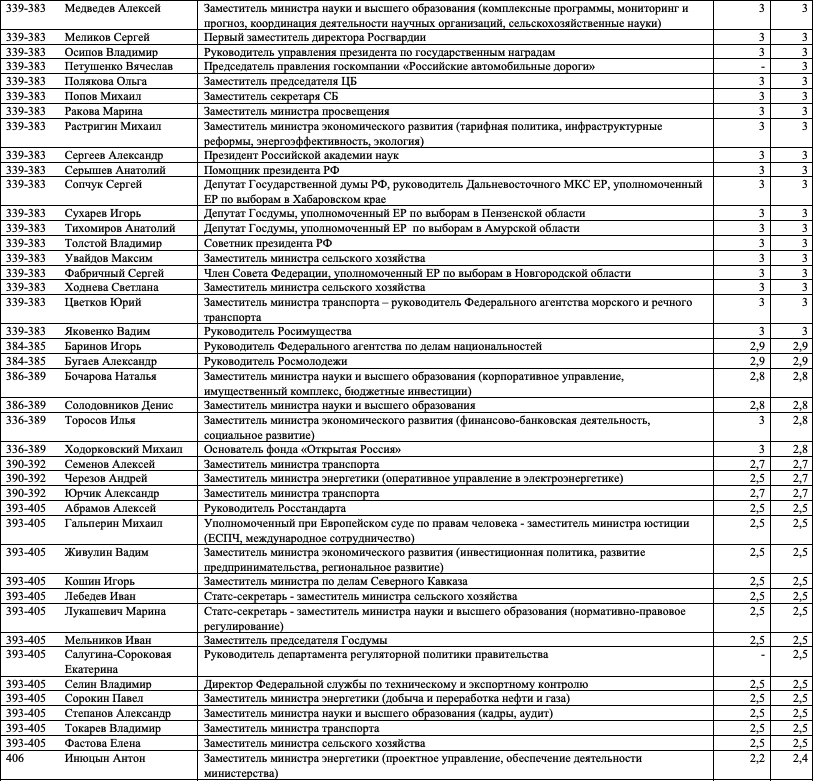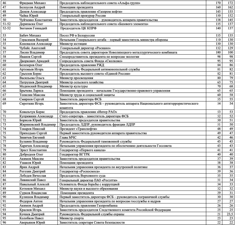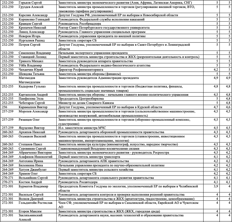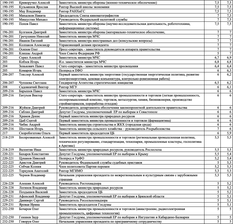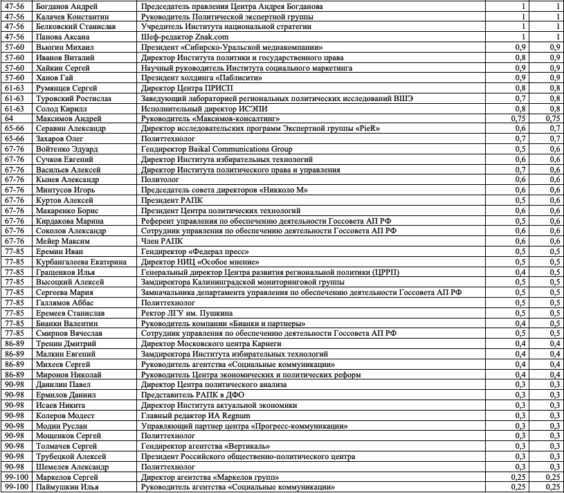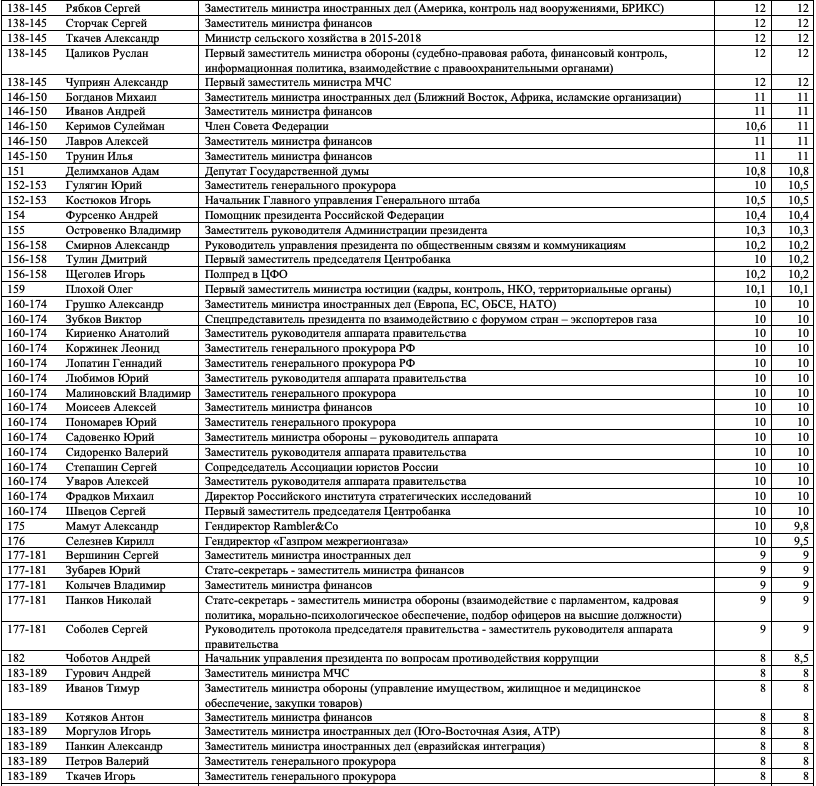 Как и в предыдущих выпусках индекса, слагаемыми оценки, полученной каждым из участников, являются профессиональная репутация персоны, ее аппаратно-лоббистский потенциал, значимость курируемой сферы, возраст, наличие крупных успехов и/или неудач.