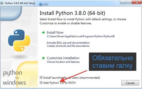 Устанавливаем Python, обязательно при установке ставим галочки: