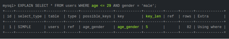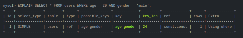 Значение key_len показывает используемую длину индекса. В нашем случае 24 байта — длинна всего индекса (5 байт age + 19 байт gender).