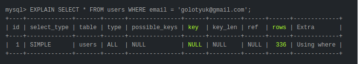 Колонка key показывает используемый индекс. Колонка possible_keys показывает все индексы, которые могут быть использованы для этого запроса. Колонка rowsпоказывает число записей, которые пришлось прочитать базе данных для выполнения этого запроса (в таблице всего 336 записей).
