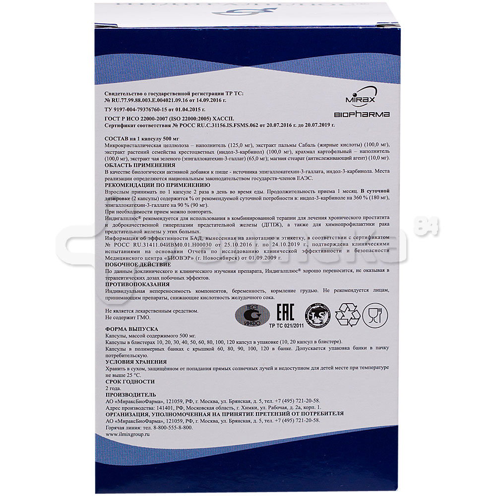 Показания к применению В качестве источника природных антиоксидантов индол-3-карбинола и катехинов (эпигаллокатехин-3-галлат) . Индигал рекомендуется для профилактики рака предстательной железы, при простатической интраэпителиальной неоплазии (ПИН) и при аденоме простаты (ДГПЖ) в составе комплексной терапии . Форма выпуска