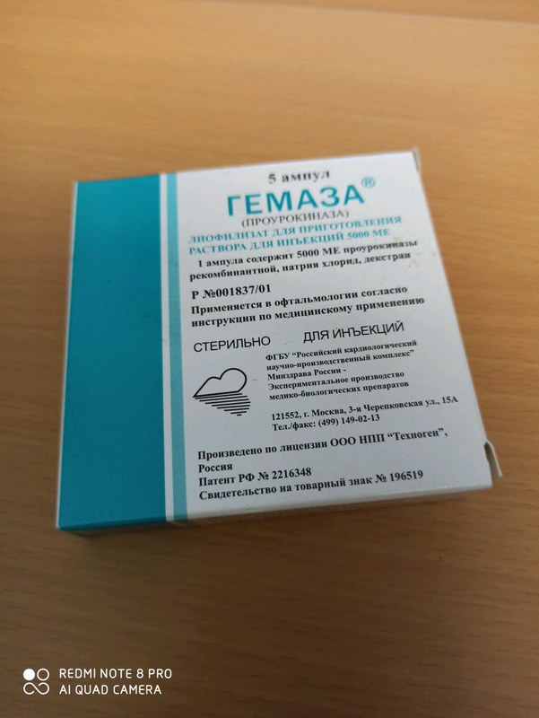 Гемаза - порошок стерильный (лифилизат) для инъекционного раствора, с фибринолитическими и тромболитическими свойствами . В офтальмологии применяется для лечения кровоизлияний в глазной полости (гемофтальм, гифема), а также последствий травм и хирургических вмешательств . Состав и форма выпуска