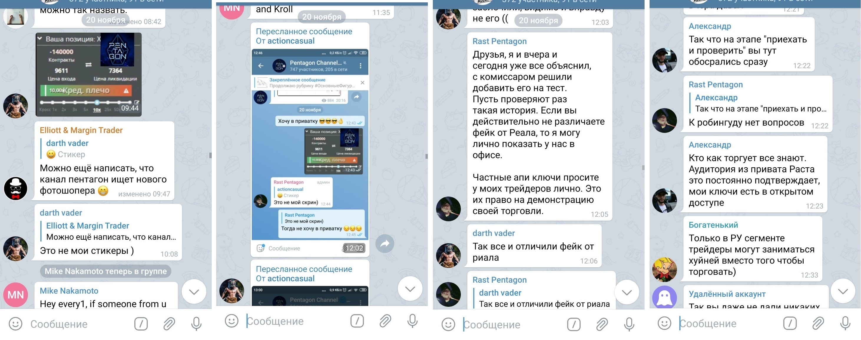 Последний пример – канал Pentagon Channel, который читают 20 моих подписчиков. Он спалился на плохом фотошопе сделки. Админ канала пытался оправдаться, что виноват контент-менеджер и он уже уволен. Потом сменил тактику и сказал, что это была провокация и скрин сделки - фейк. Было смешно это читать). Большая часть переписки уже удалена, но некоторые скрины остались.