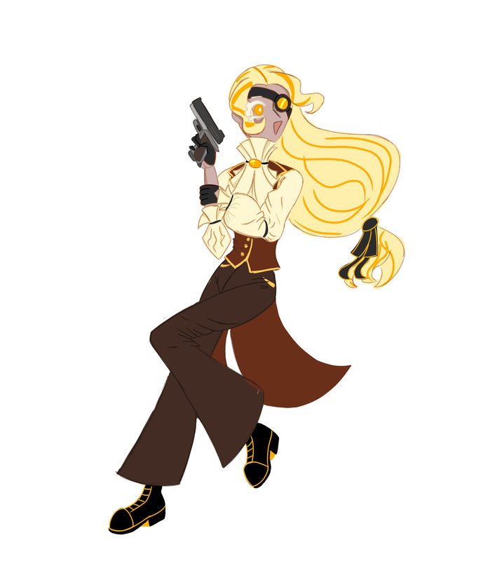 1.6 Достаточно высокая и элегантная на вид девушка с блондинистыми волосами. В волосах есть карамельные пряди, а сами волосы достаточно пушистые, хоть и укладываются по утрам. На одном глазу есть повязка с линзой, для удобства в работе с маленькими механизмами. На ней надета рубашка и фрак без рукавов, на ногах ботинки и свободные брюки. (см. Прикрепленный дизайн)