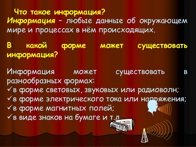 Информация может существовать в виде: текста, рисунков, фотографий, чертежей, световых или звуковых сигналов, электрических и нервных импульсов, магнитных записей …