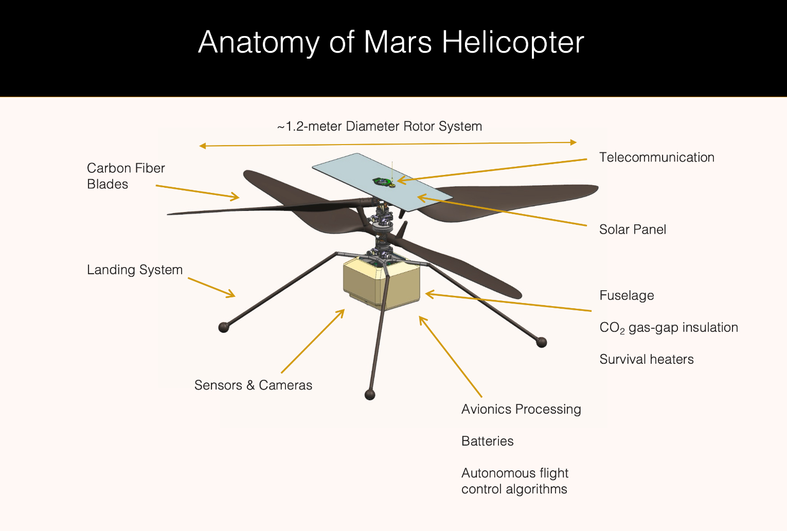 - The helicopter is designed to fly, land, communicate, manage its energy, and keep warm autonomously.