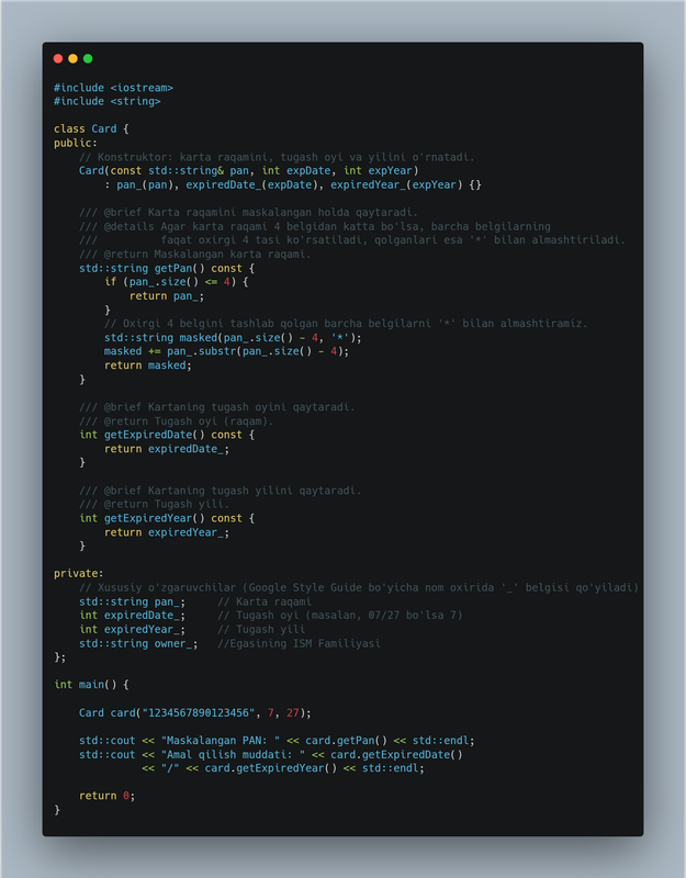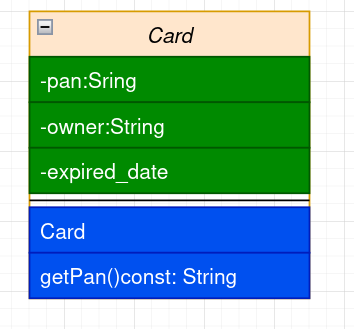 Ko'pchilik OYDT da inkapsuliyatsiya tushunchasiga kelganda mohiyatini tuliq tushunishmaydi. Bugun sizlarga real-world task asosida buni tushuntirishga harakat qilaman. Har doimgidek dasturlash tili sifatida C++ ni olamiz. Lekin siz uzingiz mos dasturlash tiliga buni ugirishiz mumkin. Tasavvur qiling siz UZCARD yoki HUMO .... kartalarni qullab quvatlashni loyihangizga qushmoqchisiz. bu kartalarni xavfsizlik va O'zbekiston qonunlariga binoan siz kartani nomerini to'liq kursatishga yoki saqlashga haqqiz yuq. Siz uni maskalangan shaklda saqlashiz mumkin. Bu albatta xavfsizik uchun bajarilgan. Kartani saqlash uchun Card sinfini tushunchasini kiritamiz. Kelilar uni birinchi UML tarzda ifodalaymiz(1.1. rasm).