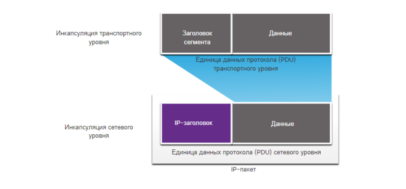 На рисунке показан последующий процесс создания единицы данных протокола (PDU) сетевого уровня и IP-пакета.