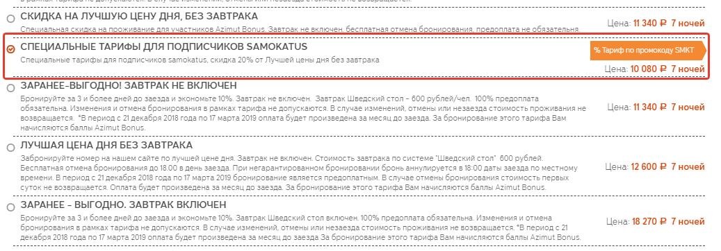 - Отель. Если бронируем на сайте Азимута с промокодом SMKT, то номер на двоих выходит 10 080 р. (5 040 р./чел) на 7 ночей.