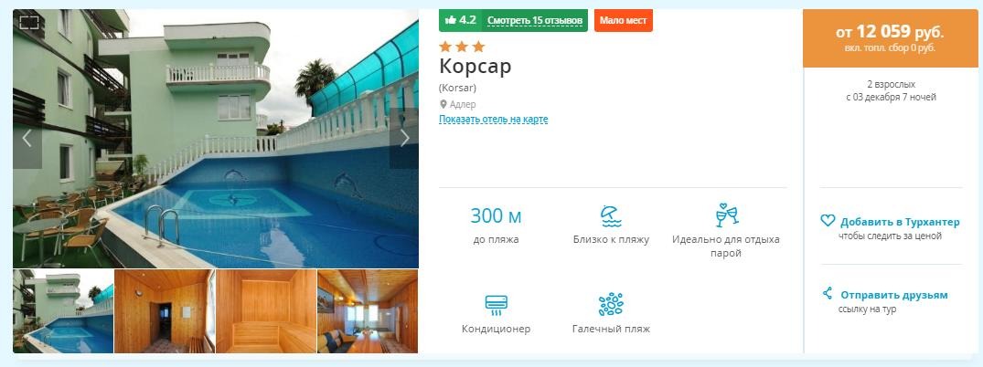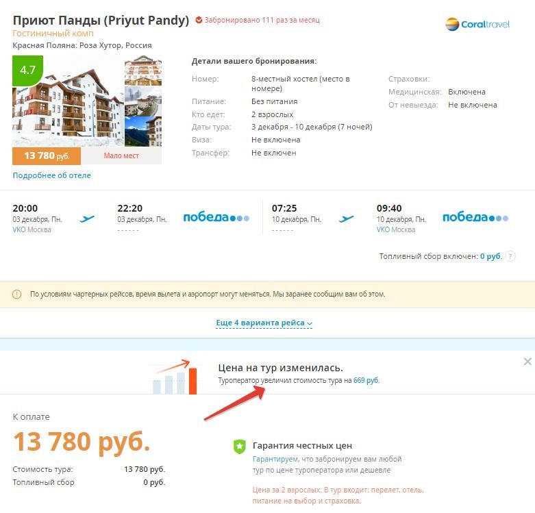 Если выбирать четкий отель - Azimut Hotel Freestyle Rosa Khutor, например, то цена вырастет до 11 420 р./чел. (и лететь придется Победой, упаси господи). Но! Это сетевой отель, и на их сайте можно получить лучшую цену.