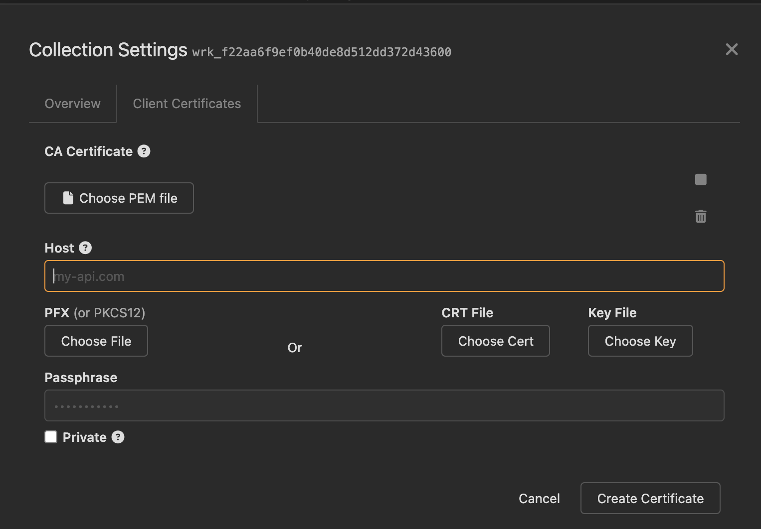 Выбрать "Collection Settings" -> "Client Certificates". Нажать "New Certificate"