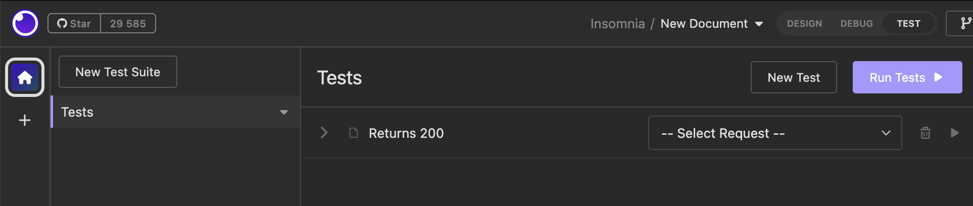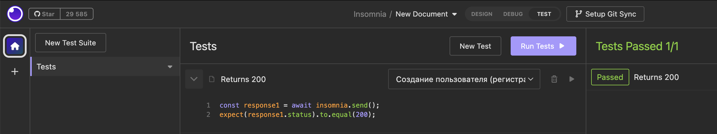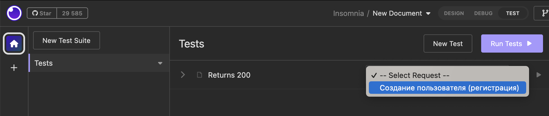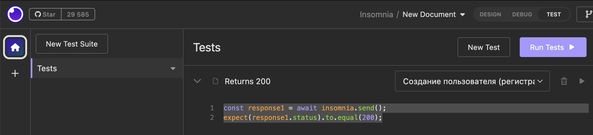 Нажать на кнопку "New Test" -> Оставить дефолтное название "Returns 200" (так как при создании пользователя возвращается статус код 200) -> нажать на "New Test"