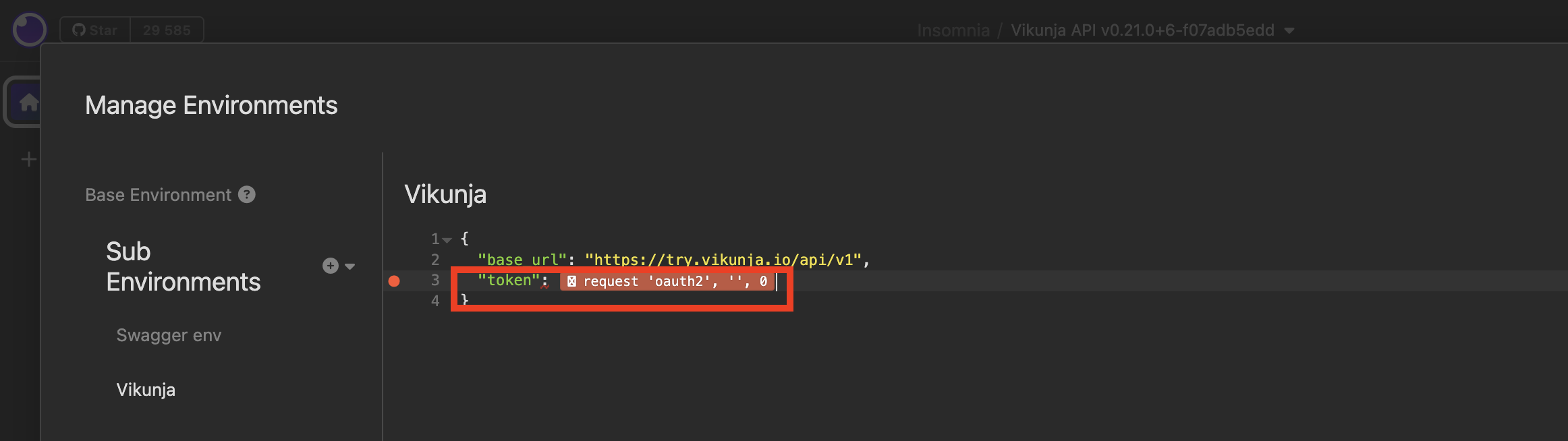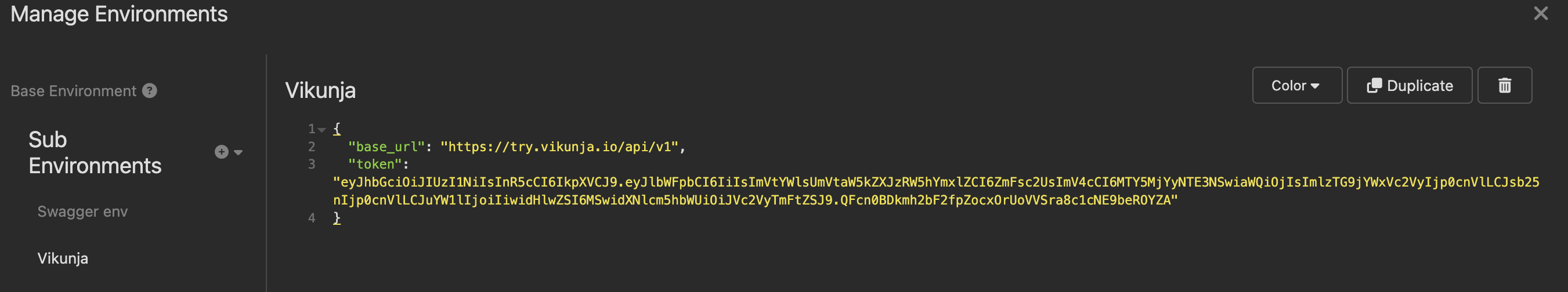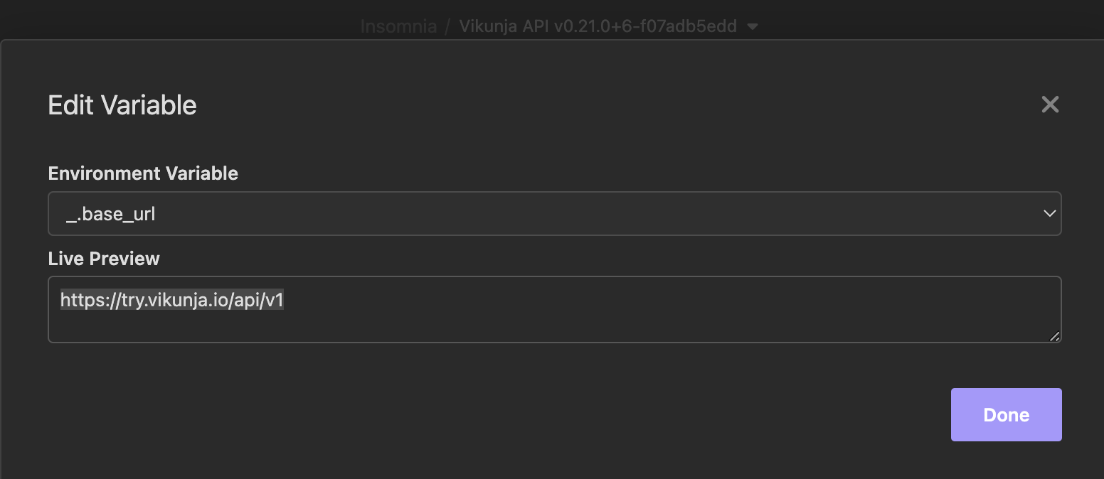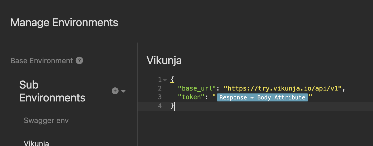 Предусловие: Выбрать "Vikunja" окружение в левом верхнем углу -> Выбрать "Manage Environments" -> Добавить новую переменную c значением: