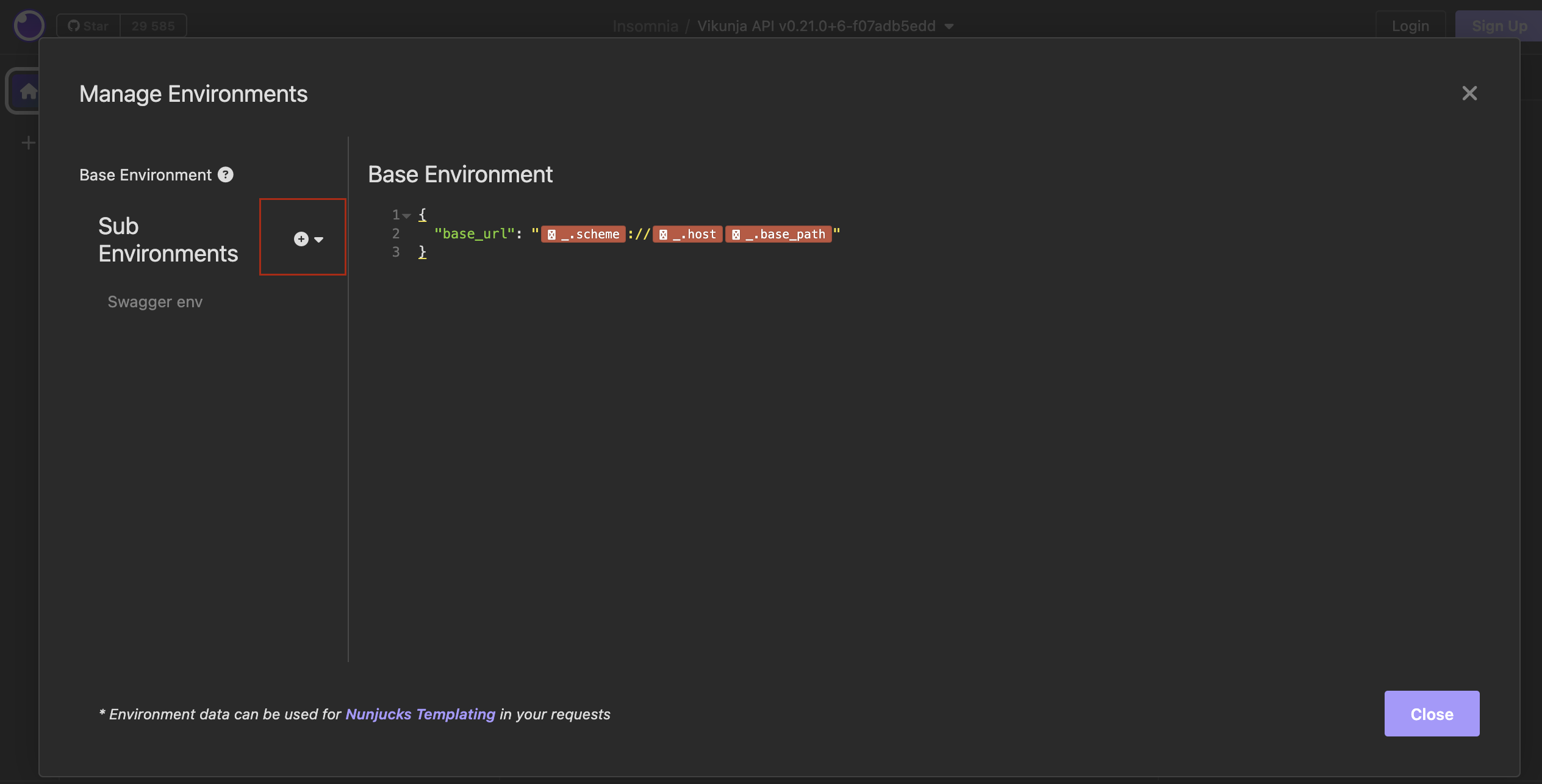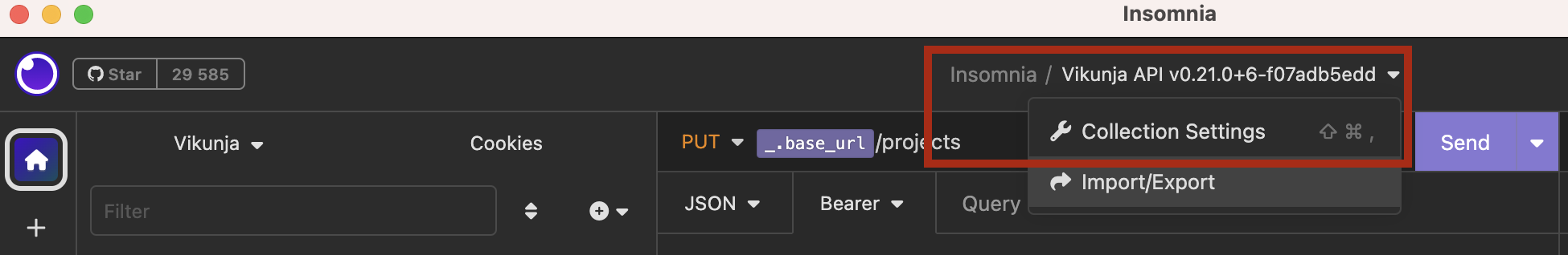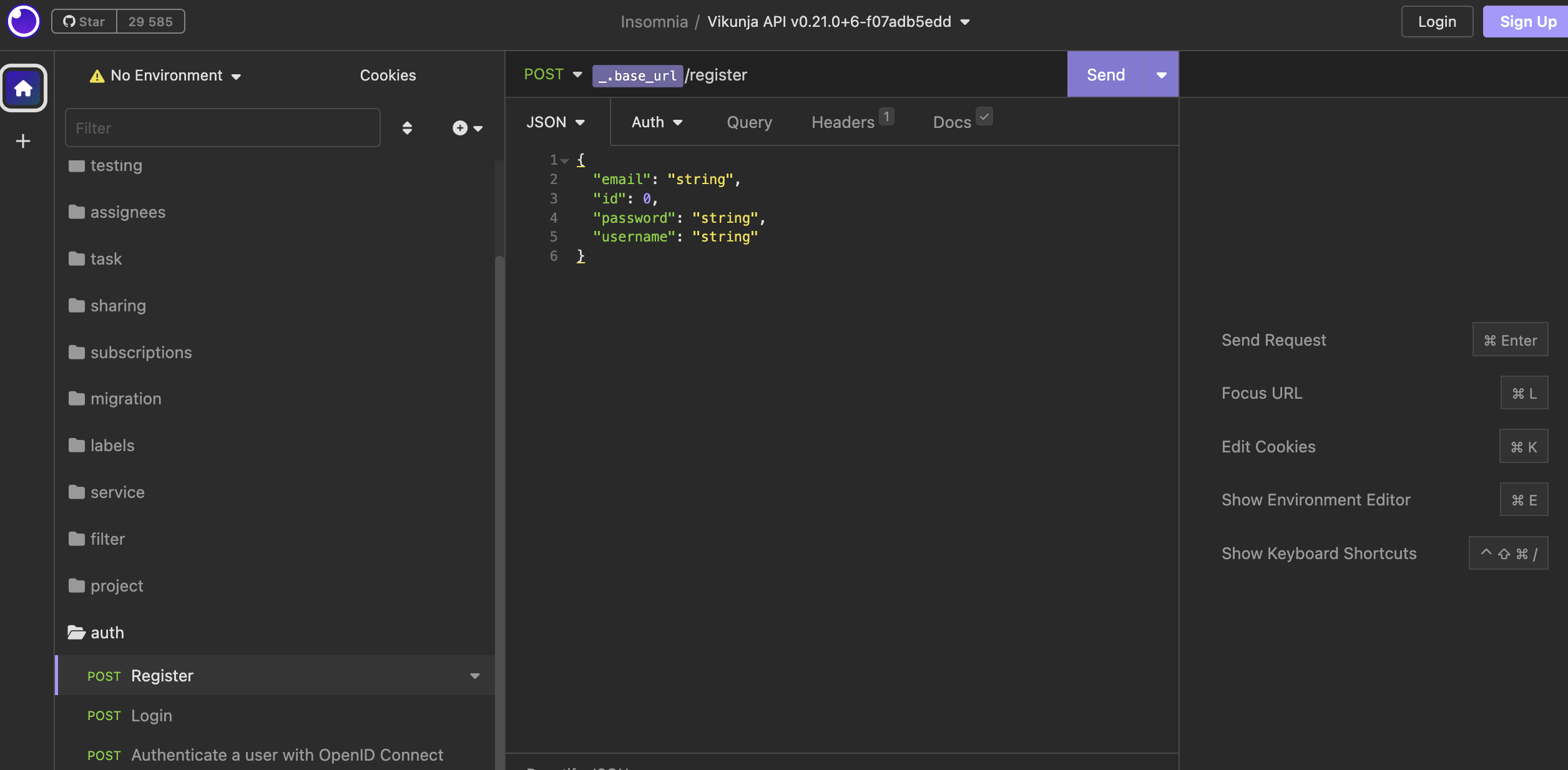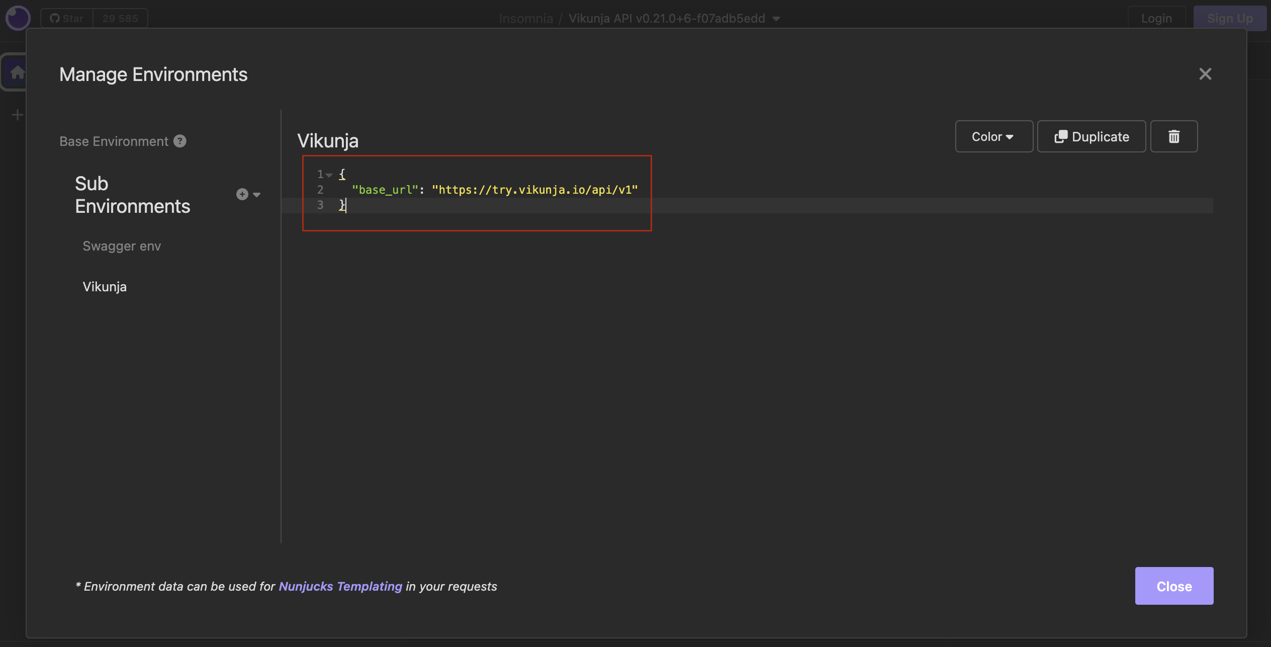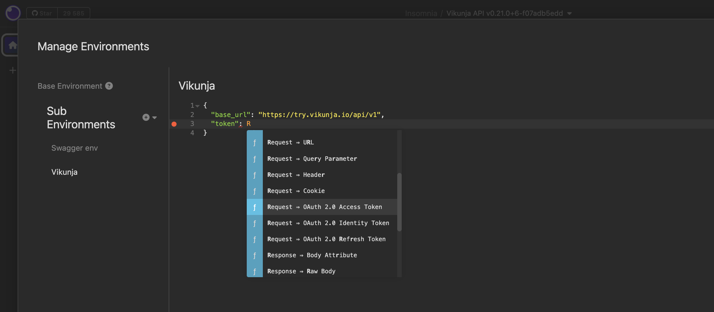 Предусловие: Выбрать "Vikunja" окружение в левом верхнем углу -> Выбрать "Manage Environments" -> Добавить новую переменную c значением: