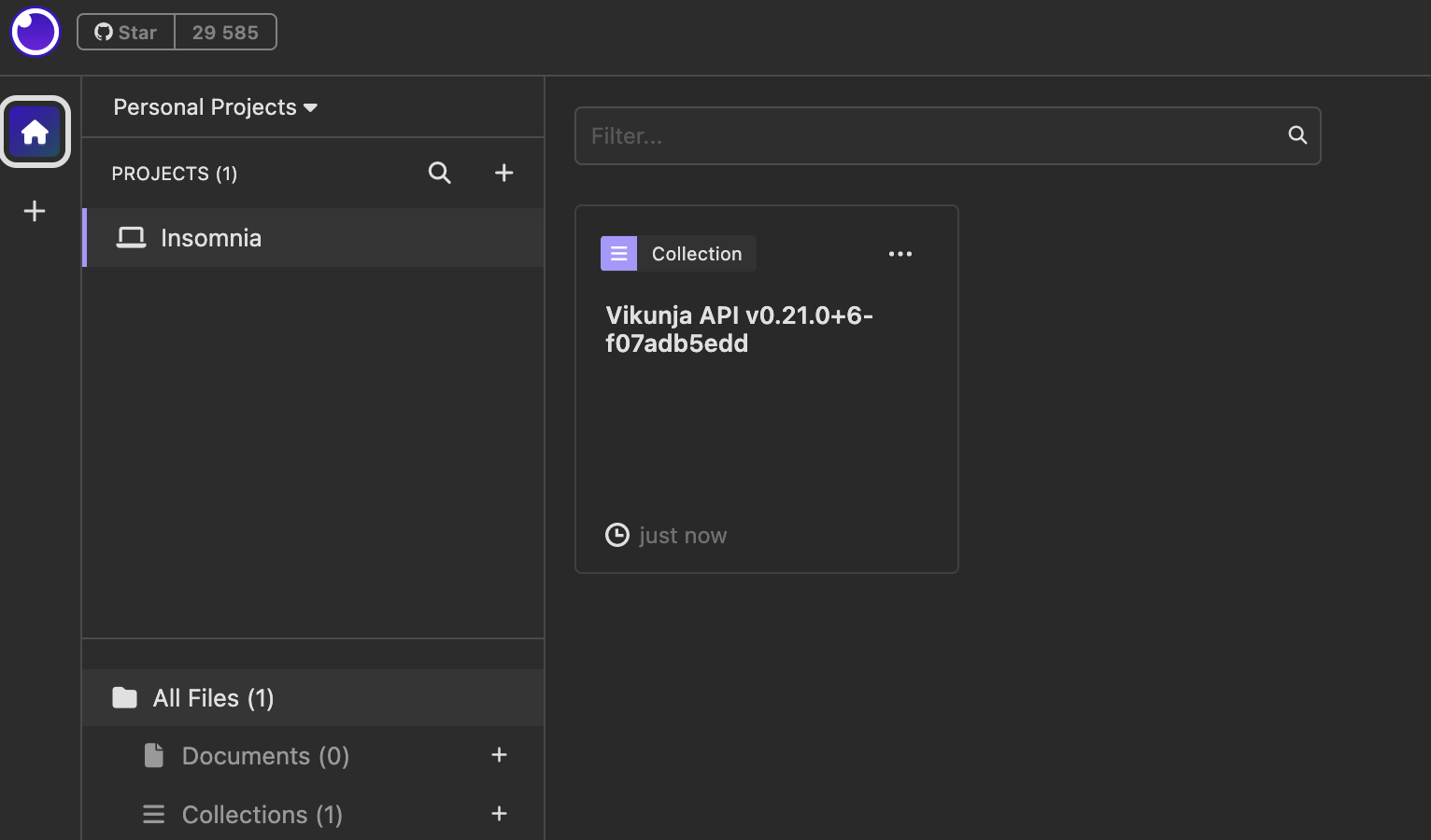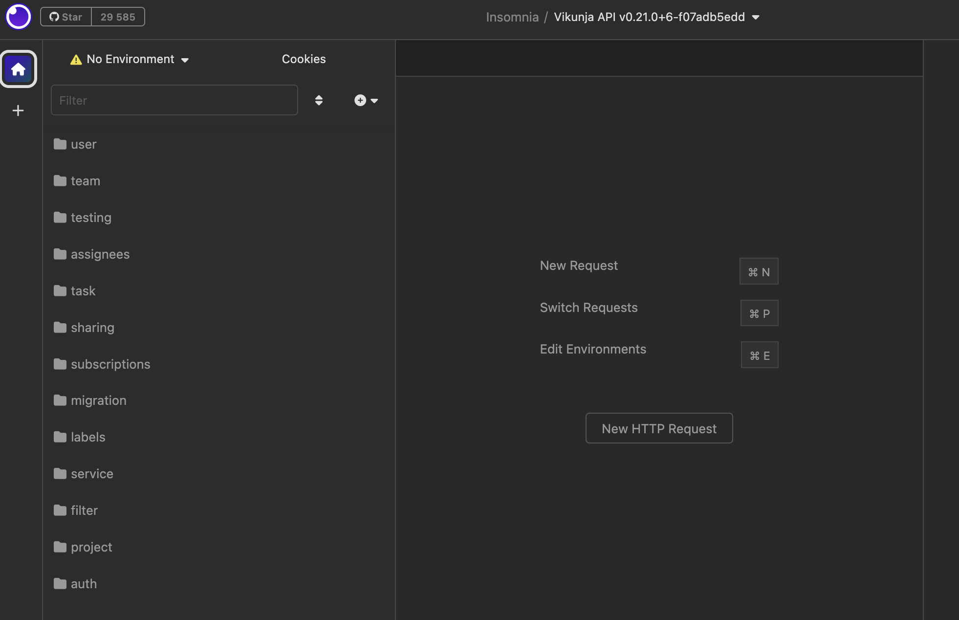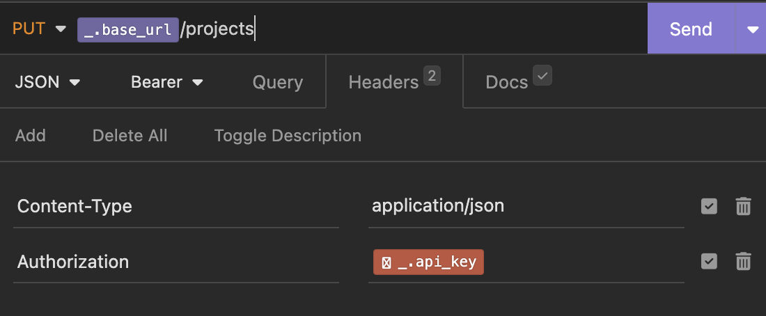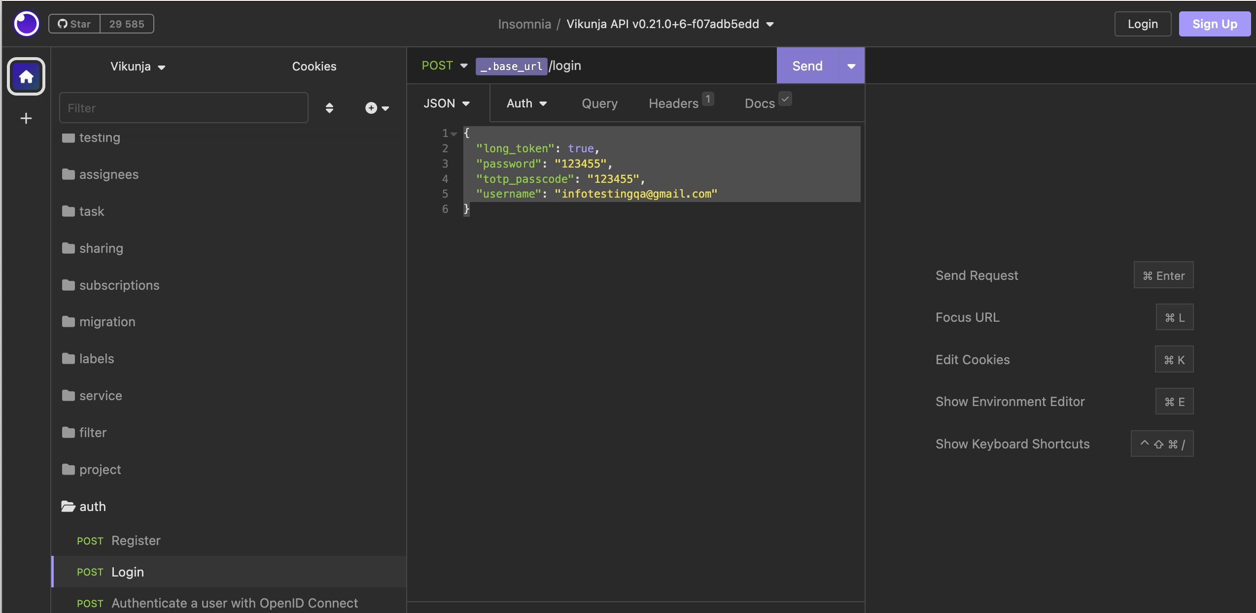 Предусловие: Выбрать "Vikunja" окружение в левом верхнем углу -> Выбрать "Manage Environments" -> Добавить новую переменную c значением: