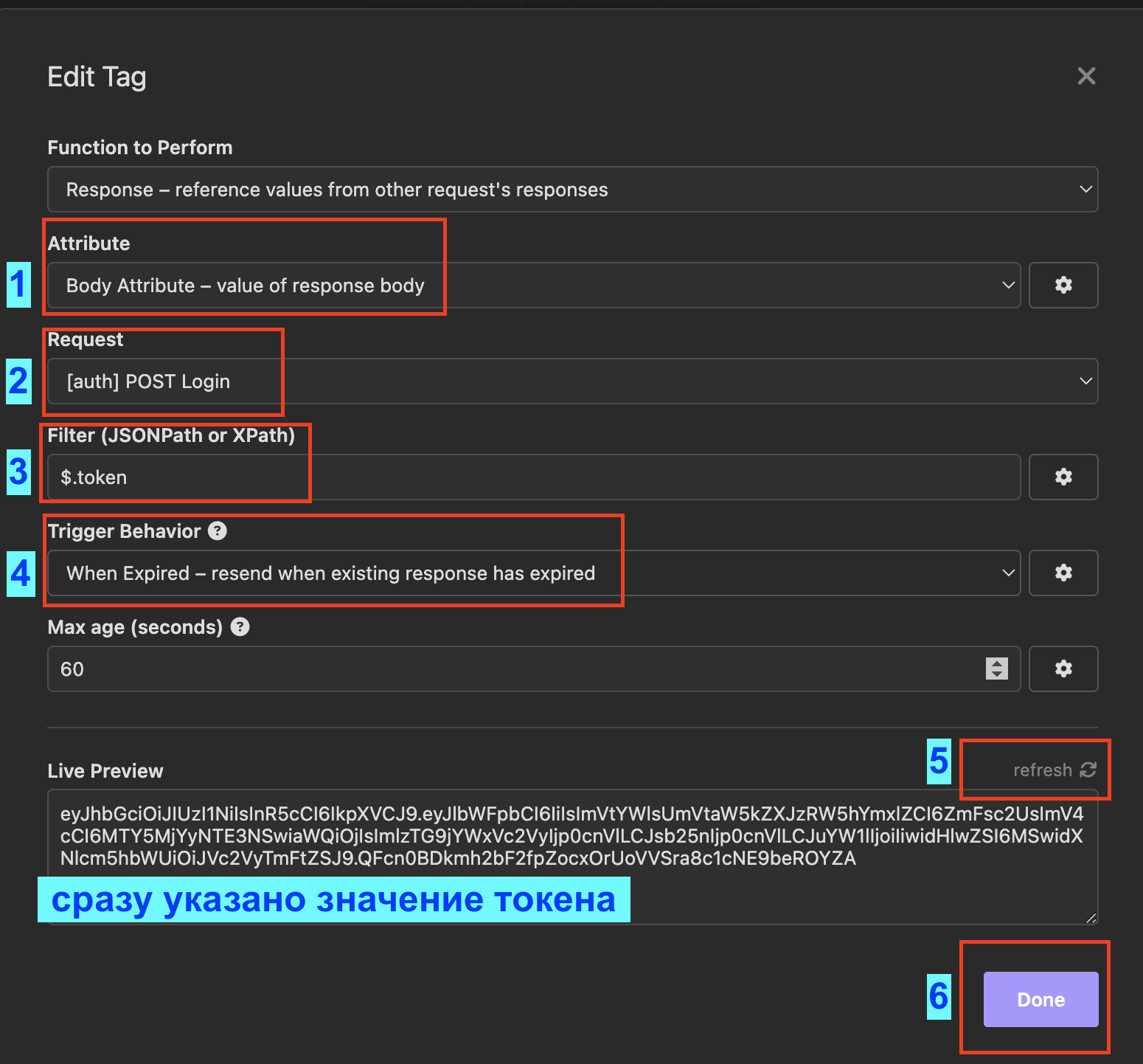- Указать конкретный ключ, начиная с $., а именно $.token, и в "Live Preview" сразу отображается значение токена.