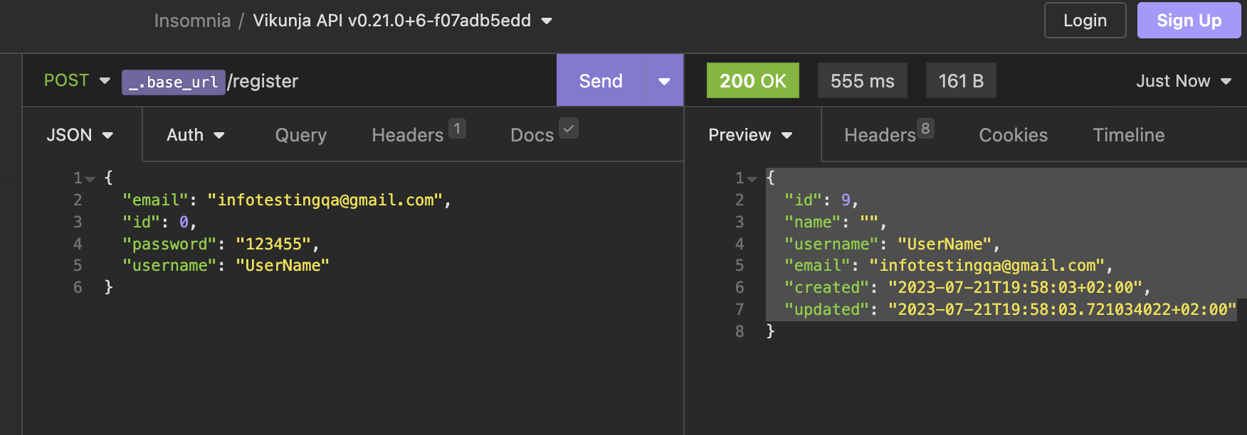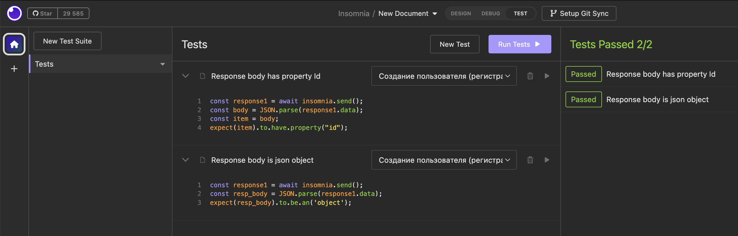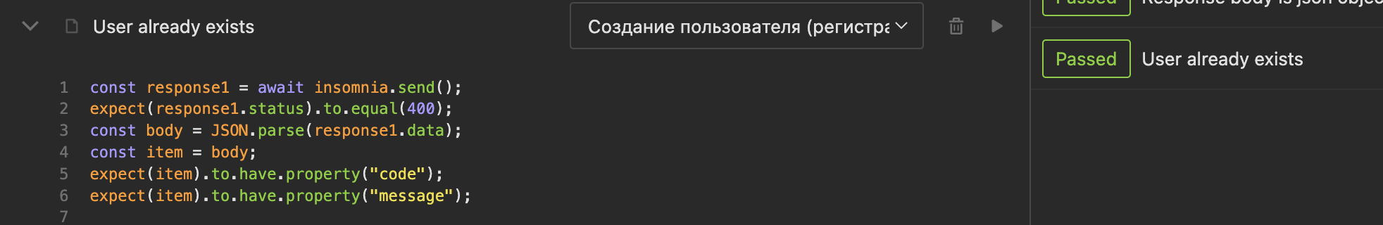Добавлены два теста на отправку регистрации пользователя "Response body has property Id" и ''Response body is json object". Каждый раз отправляется новый тест, поэтому второй тест будет отображать ошибку, что такой пользователь существует (для этого случая будет создан новый тест "User already exists".