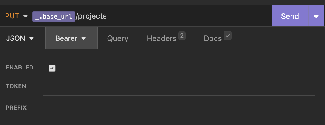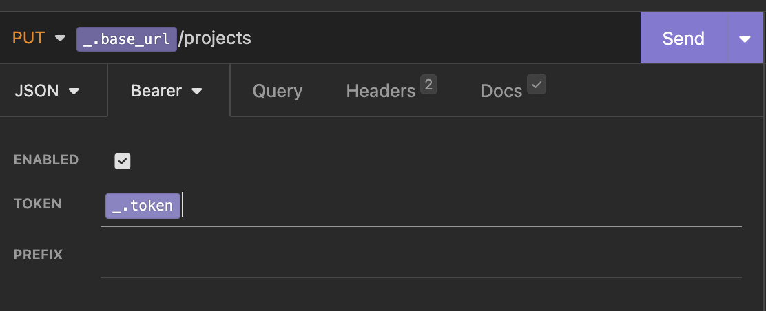 Выбрать вкладку "Auth" , нажать на стрелочку вниз (точнее раскрыть) и выбрать тип аутентификации "Bearer Token". Начать вводить значение {{_ в поле "TOKEN" и выбрать переменную "_.token". Нажать на кнопку "Send".