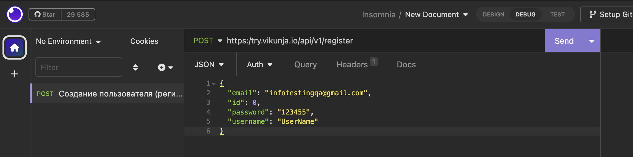 Выбрать вкладку "DEBUG" - > Добавить запрос на создание пользователя ->