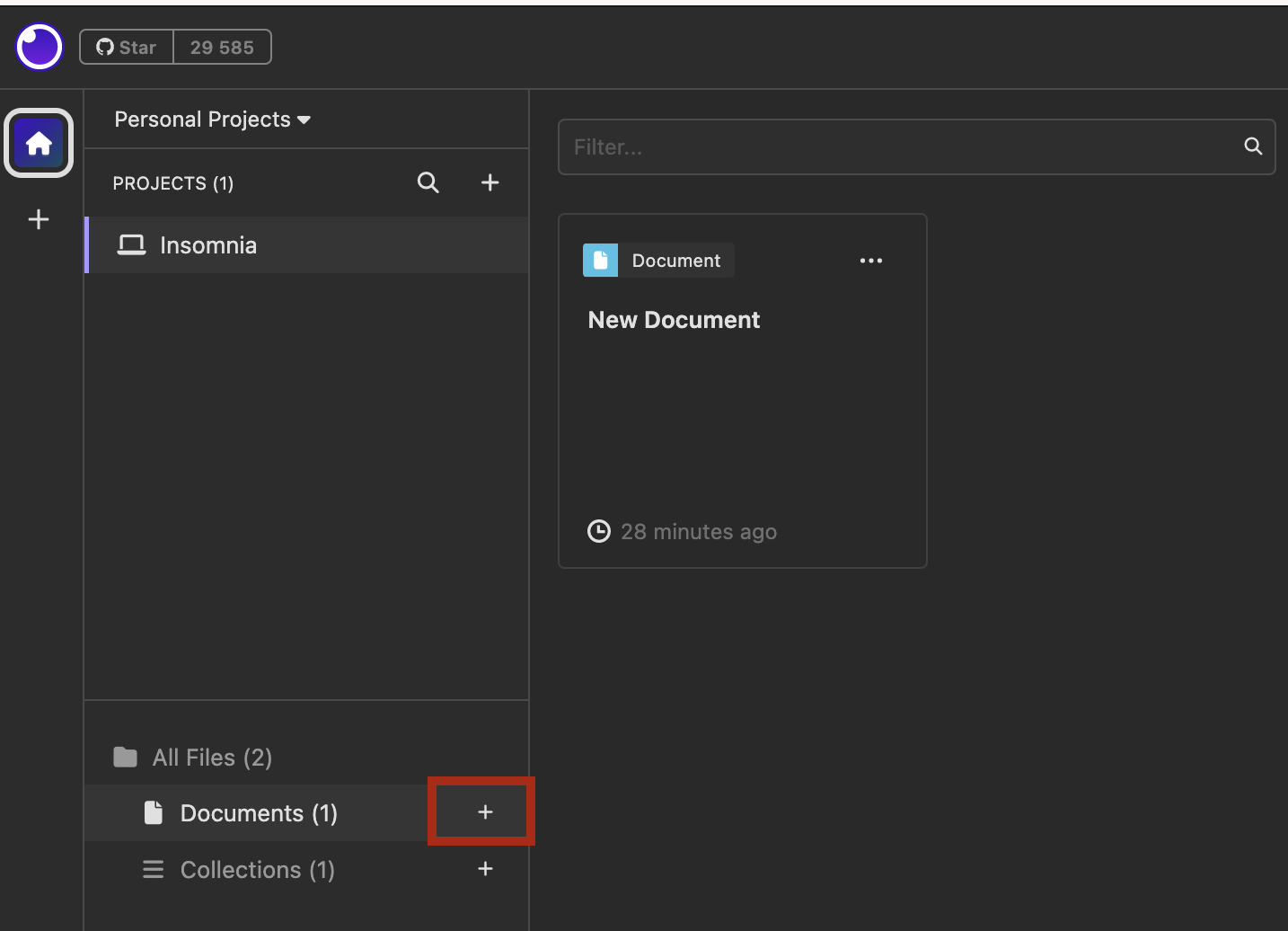 Нажать на иконку "Домашняя страница" -> "Найти All Files" -> "Documents" -> Нажать на "+"