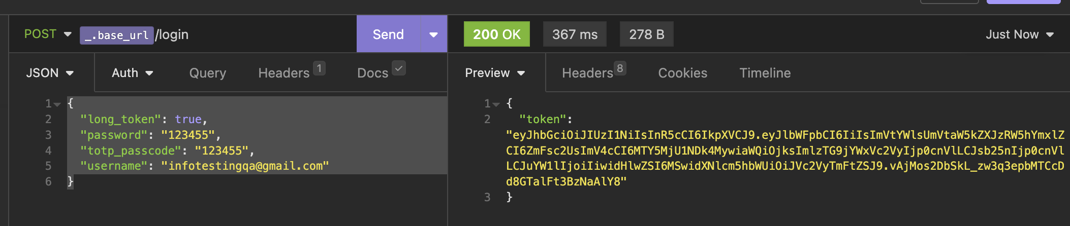 Нажать на кнопку "Send". Пользователь авторизован в систему. Получен токен. Ура :)!