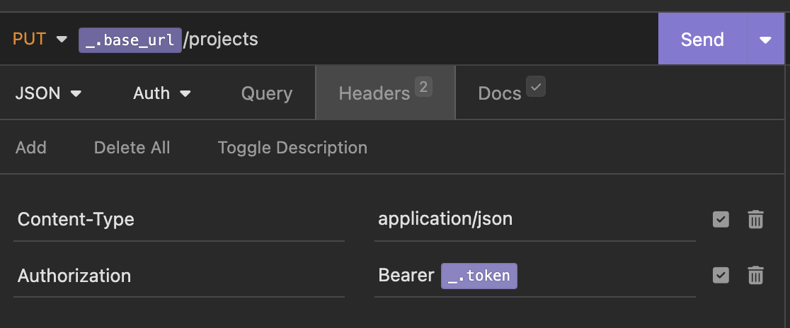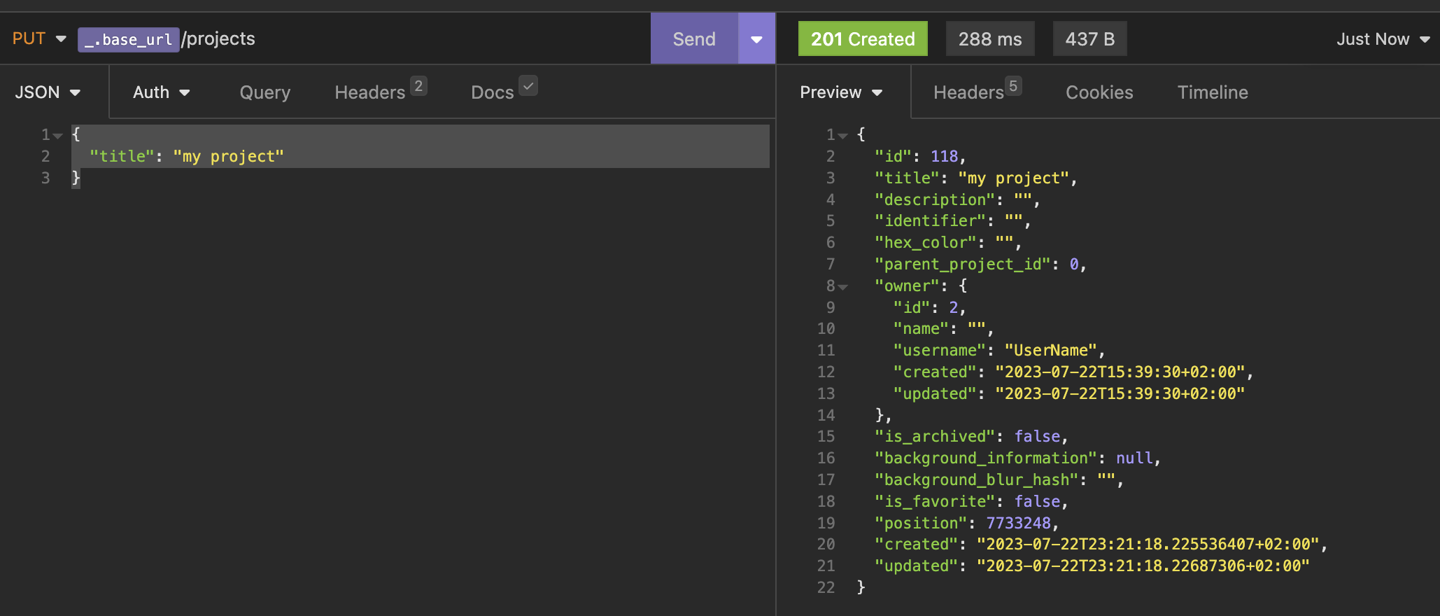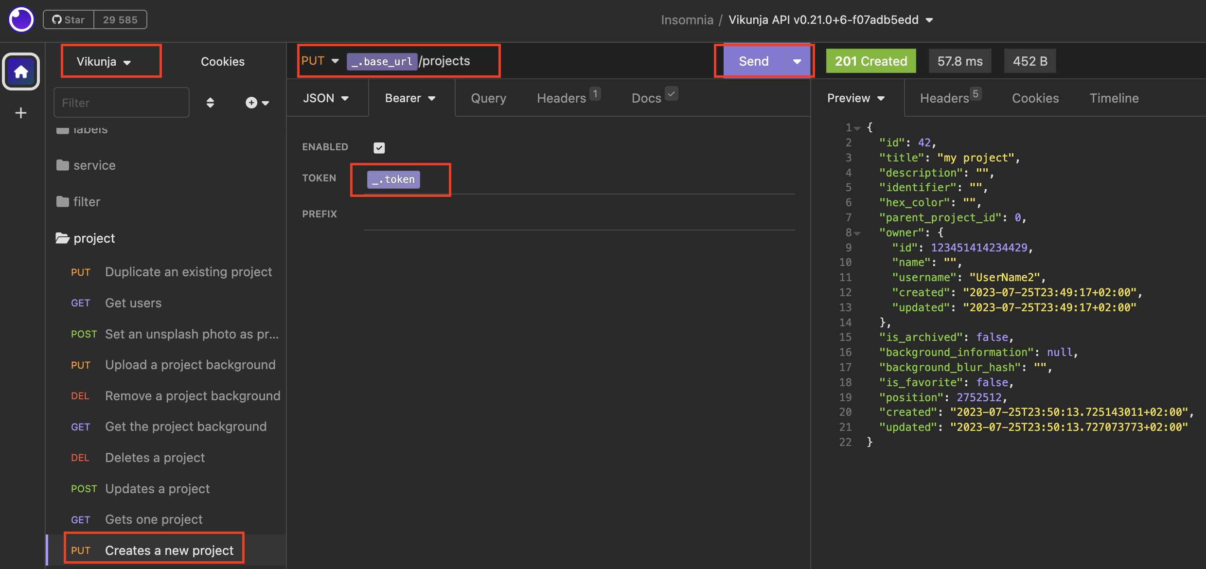 Теперь используем созданный токен в запросе для создания проекта.
