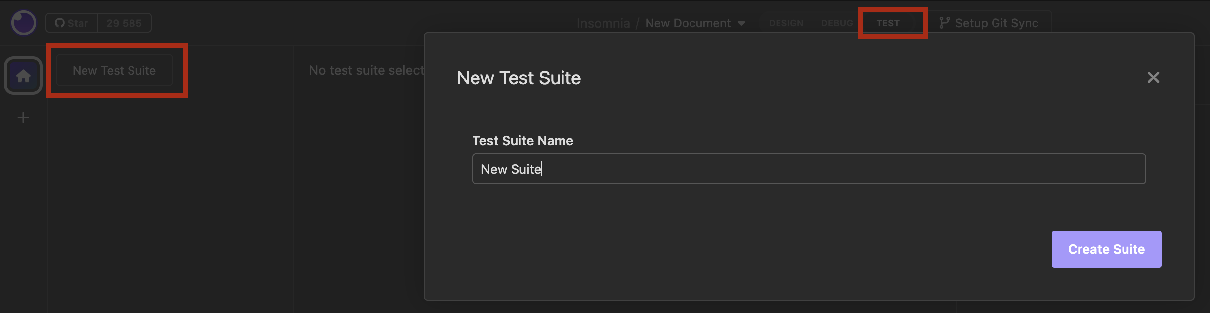 Указать название "Tests" -> Нажать на кнопку "Create Suite"