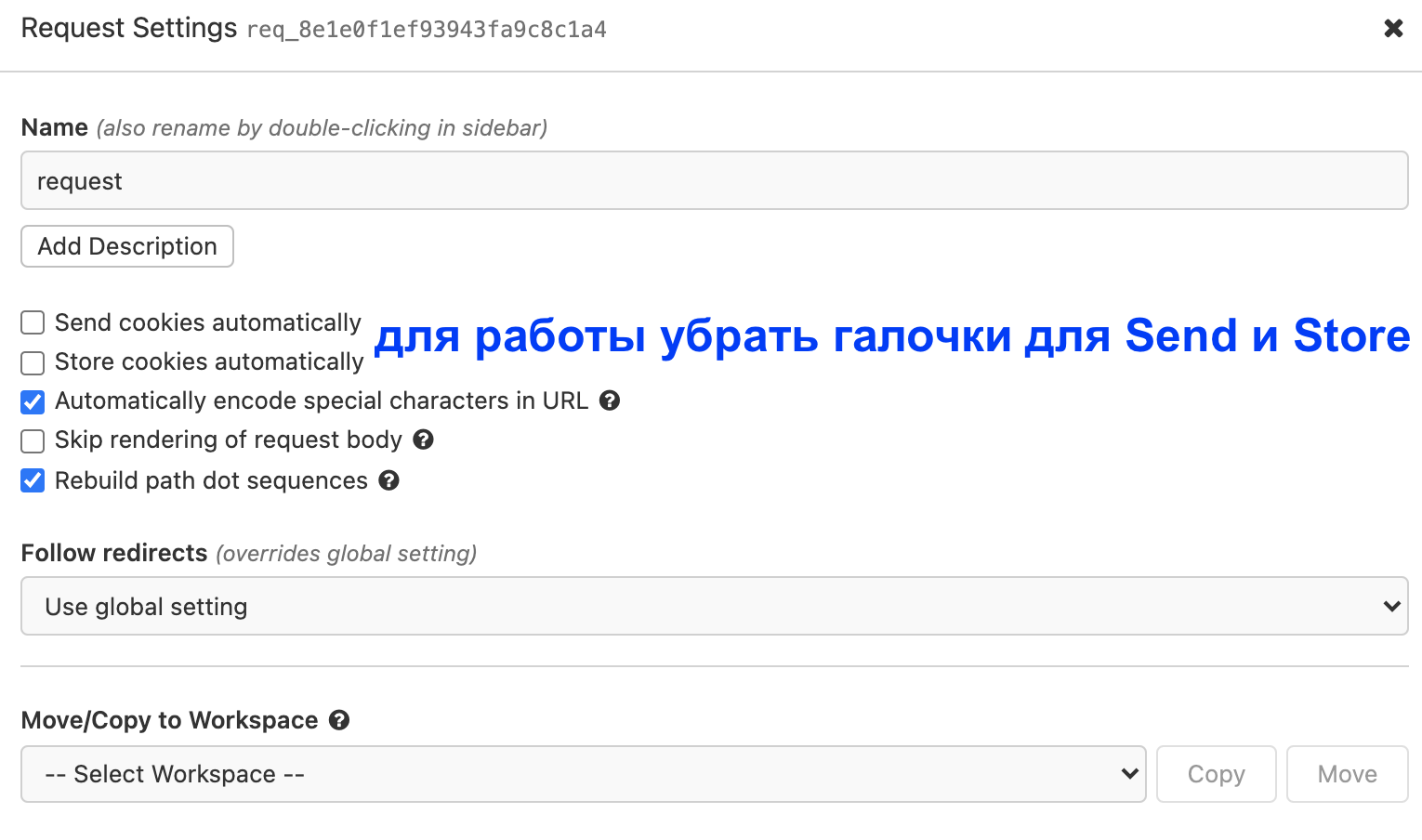 Для нашей работе в настройках запроса убрать галочки в чек-боксах "Send cookies automatically" и "Store cookies automatically":
