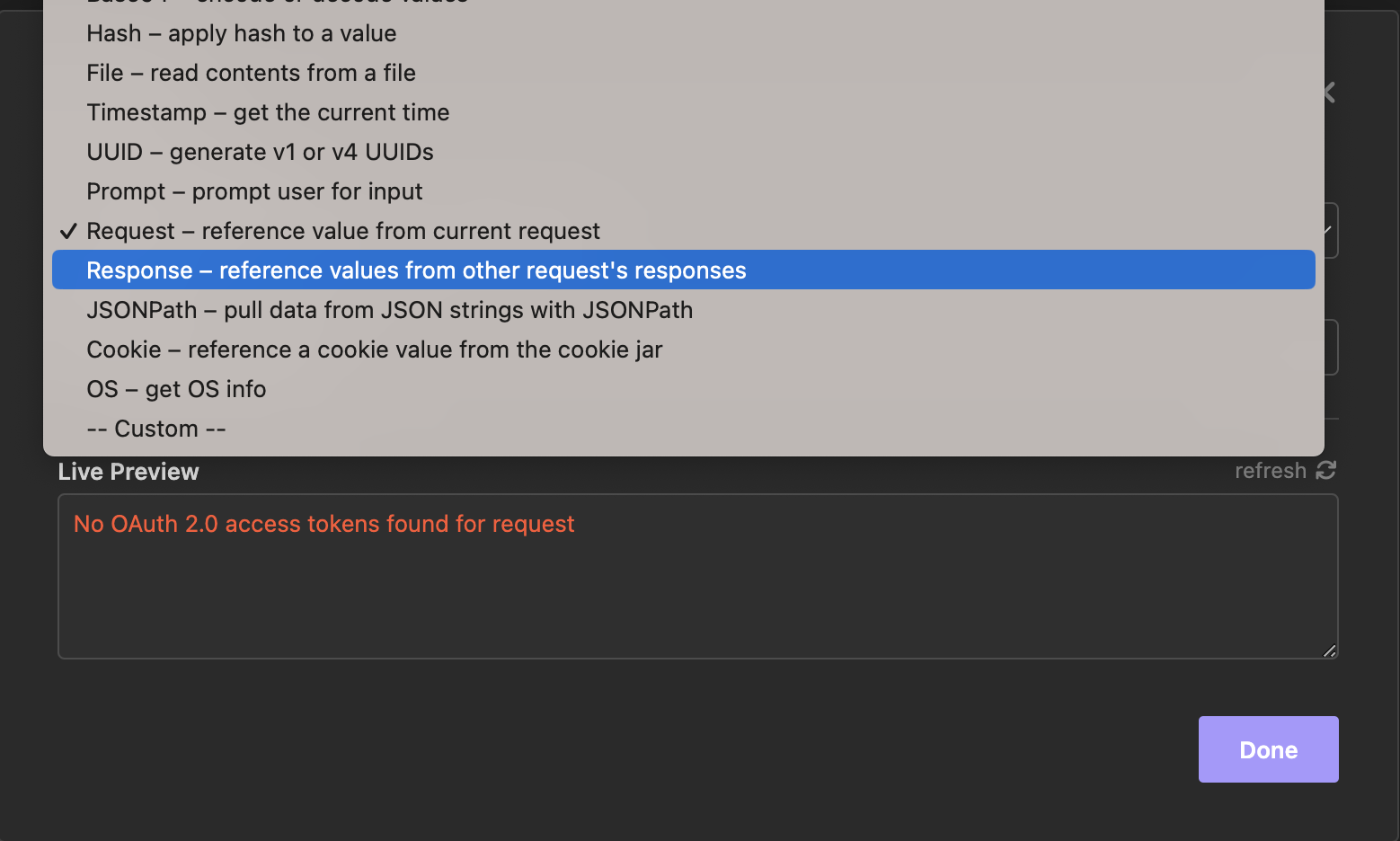 Далее выполнить конфигурацию, выбрать "Response - reference values from other request's responses"
