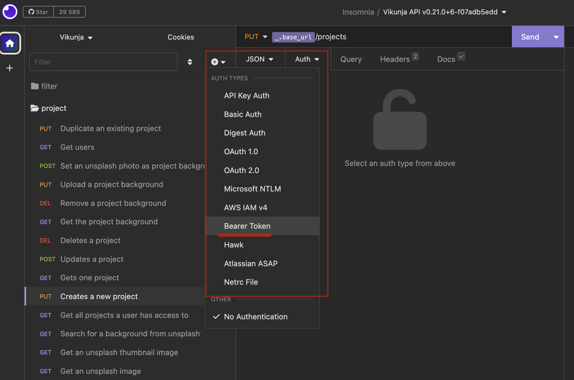 Выбрать вкладку "Auth" , нажать на стрелочку вниз (точнее раскрыть) и выбрать тип аутентификации "Bearer Token"