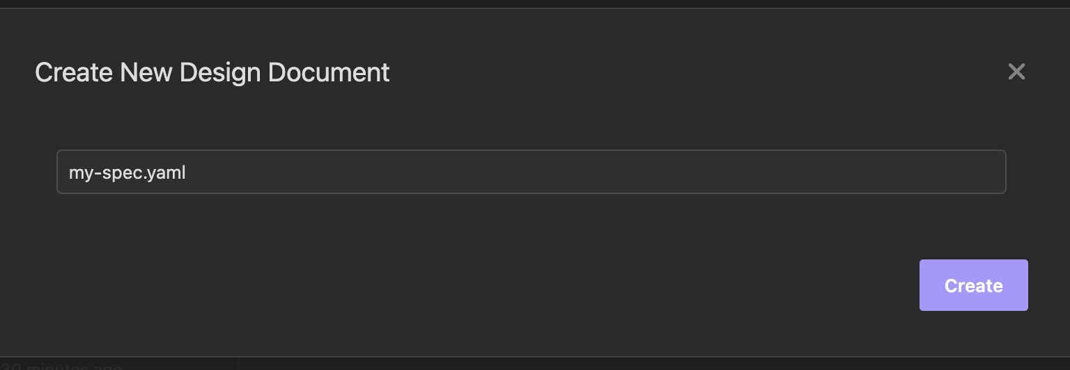Система отображает всплывающее окно "Create New Design Document", оставить "my-spec.yaml" и нажать на кнопку "Create"