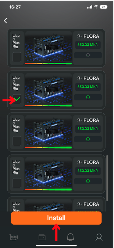 Next, you will be directed to a page where the available Rigs for energy replenishment will be displayed. Choose the Rig you want to install energy into and click the "Install" button.