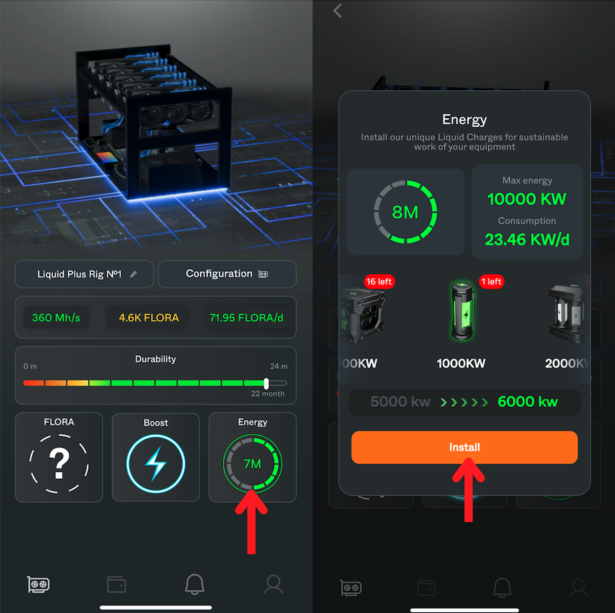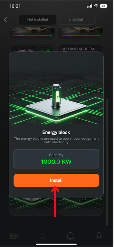 If your Rig already has Energy but you want to add more, navigate to the Rig page and click on the "Energy" button. In the pop-up window, you will see the available Energy, the Rig's energy capacity (the maximum amount of energy a user can install) and the energy consumption per day. Simply select the desired amount and click the "Install" button. The current energy level and the value after installation will be displayed beneath the chosen energy option.