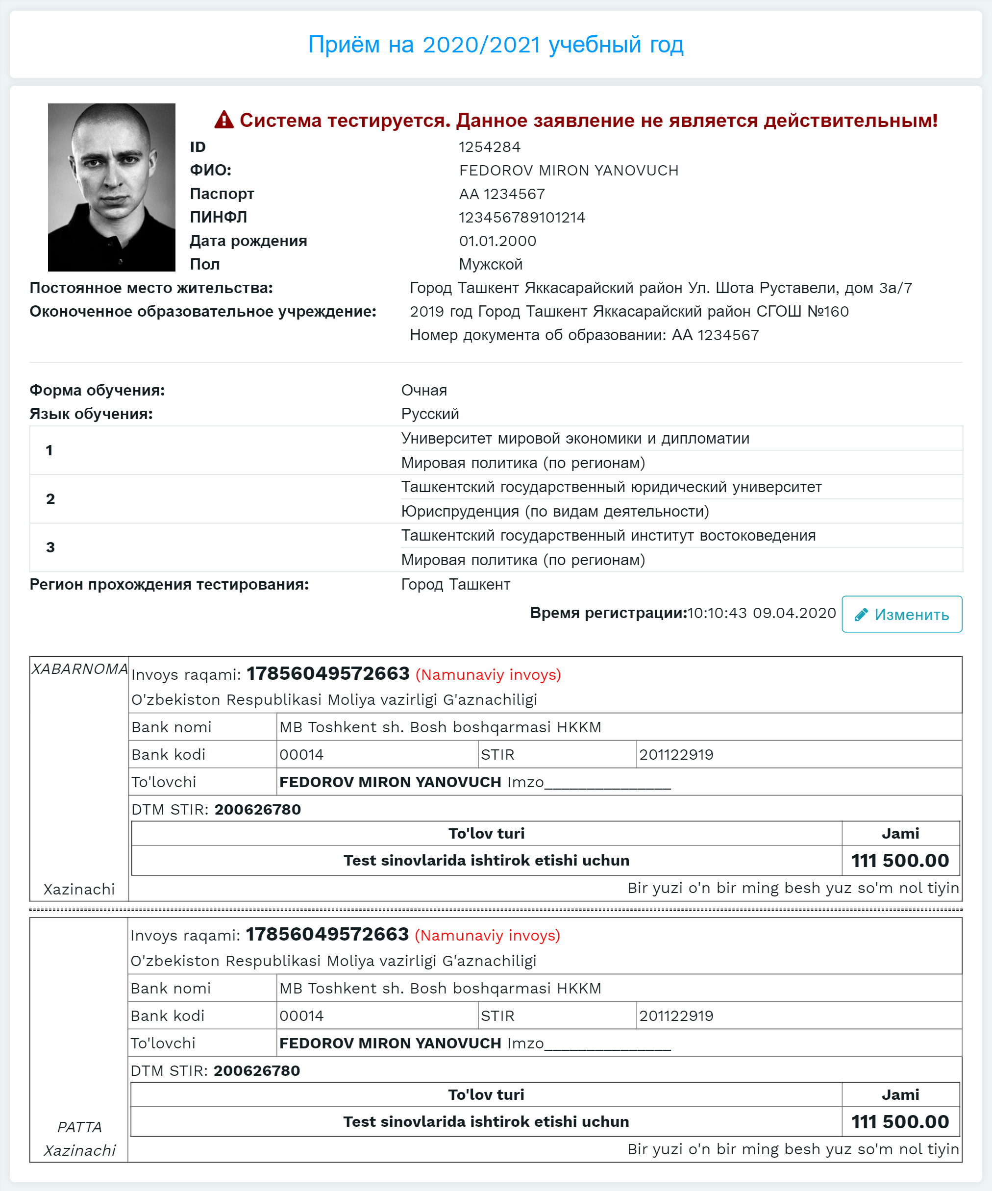 После нажатия кнопки «Сохранить» информация об абитуриенте сохраняется в базе данных Государственного центра тестирования, и отображается информация о регистрации абитуриента (Рис. 10):