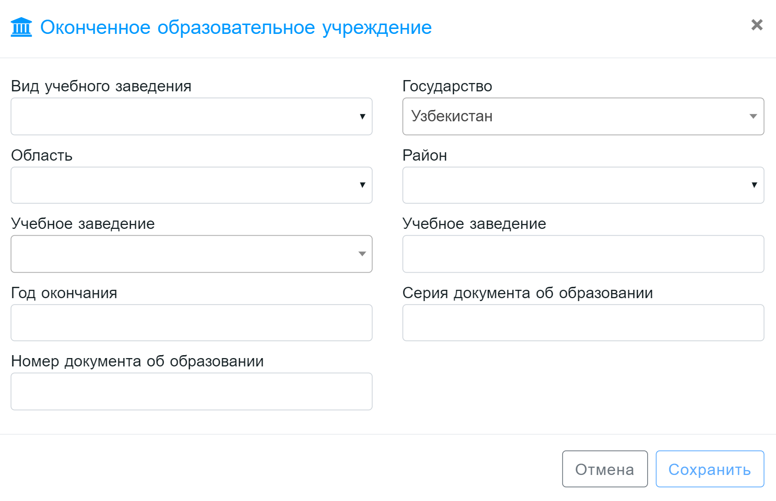 Раздел «Оконченное образовательное учреждение» отображает информацию о среднем образовании пользователя. Нажмите кнопку Изменить, откроется следующее окно: