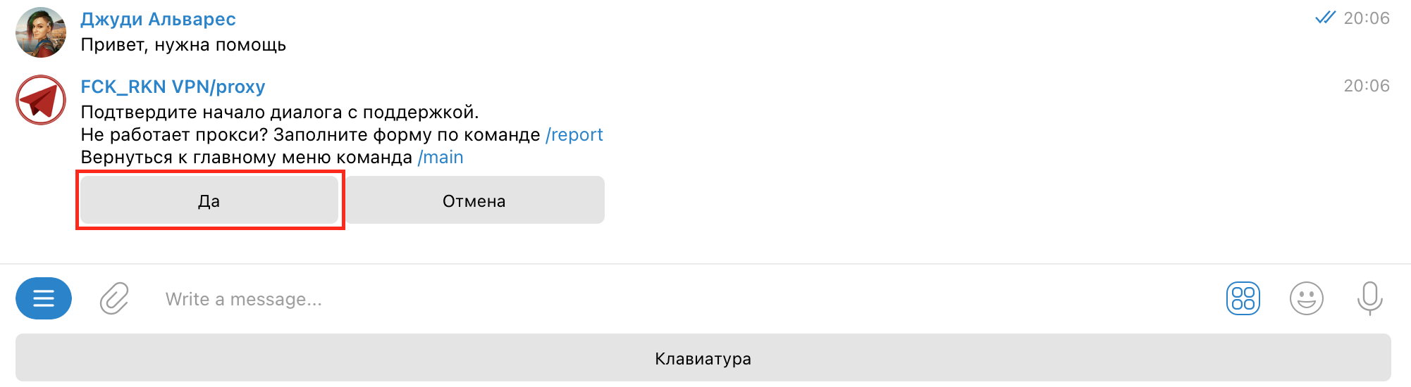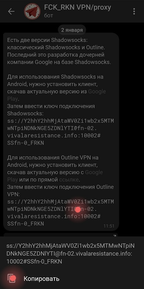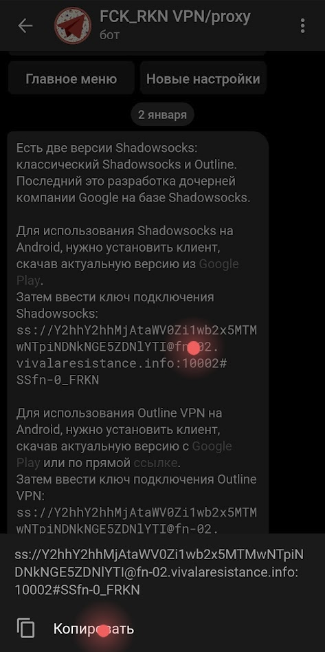 2. Скопируйте конфигурацию (ss://Y2hhY2hhMjA...), которую Вам выдал бот.