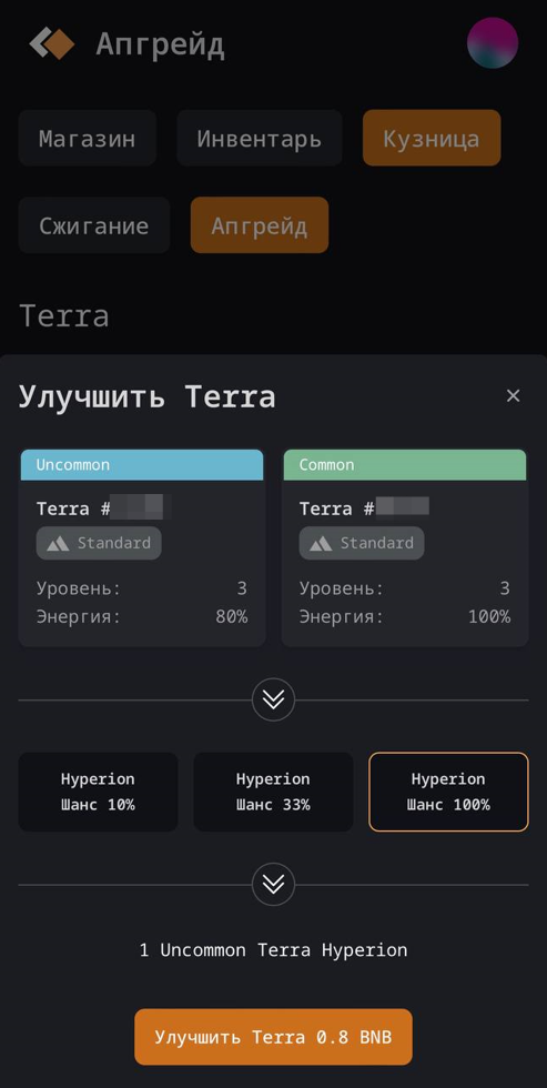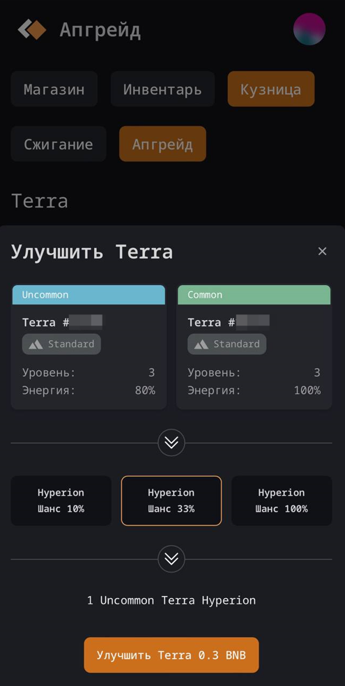 Для этого нам понадобится одна Terra Standard Rare и одна Terra Standard Common. Доплачиваем 1,8 BNB и готово! Terra Hyperion Rare - как результат!