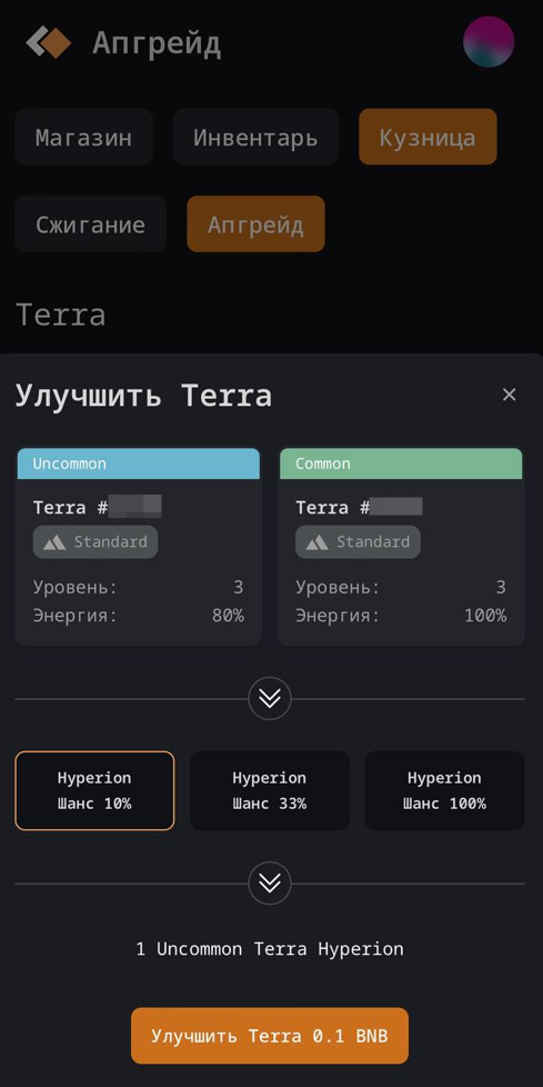 Те, кто при сжигании получил Terra Standard Uncommon, получат опцию улучшить полученное Terra Standard Uncommon до Terra Hyperion Uncommon.
