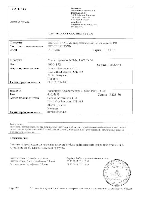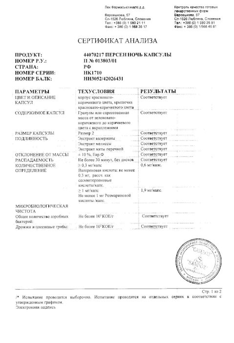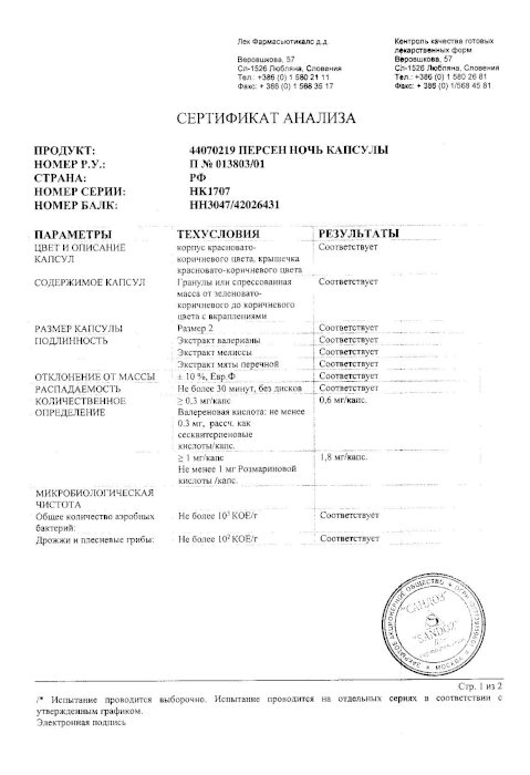 Инструкция по применению лекарственного препарата для медицинского применения . Регистрационный номер: П n013803/01-290708 . Торговое название препарата: Персен ® Ночь . Лекарственная форма: капсулы .